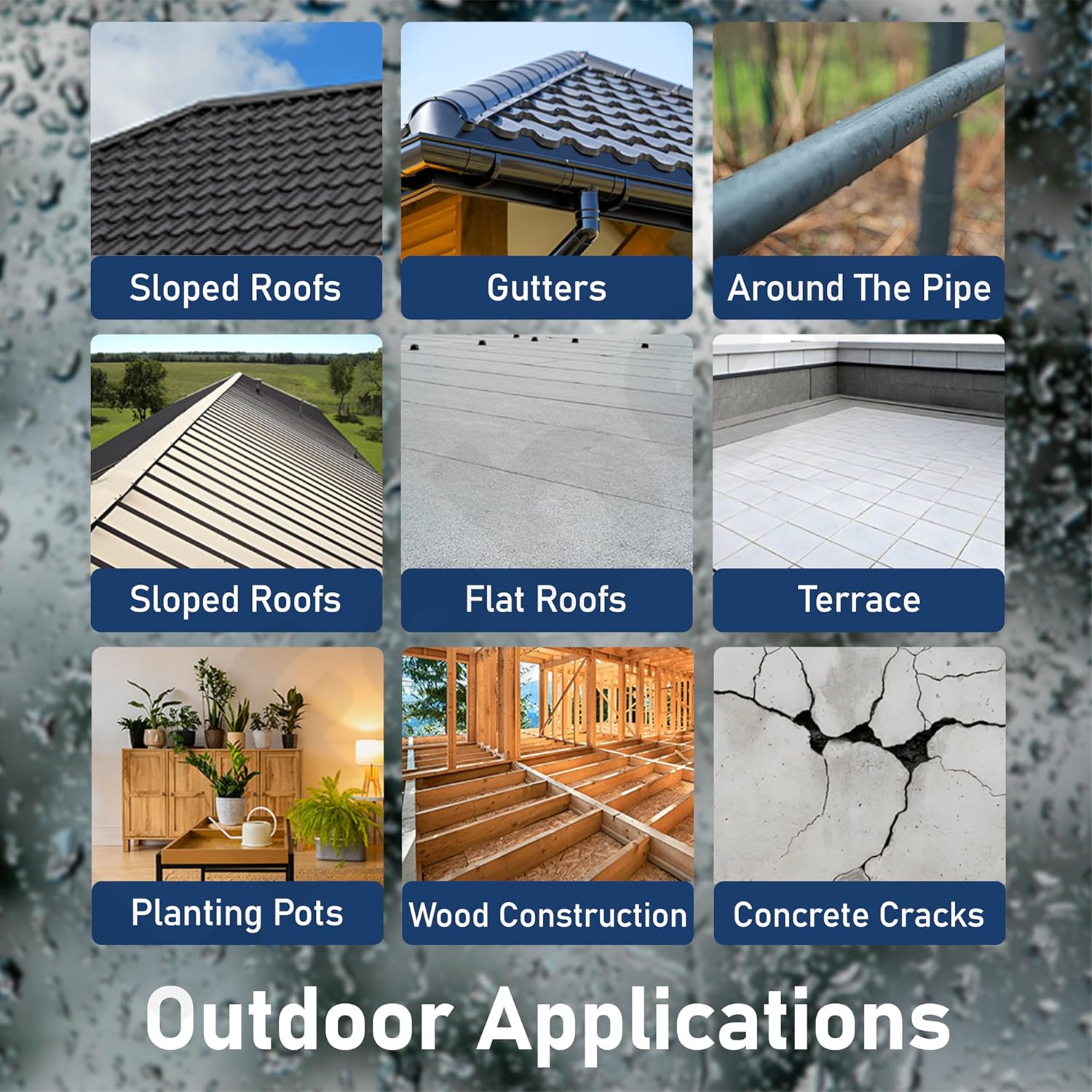 Applicable Scenarios: Flat roofs, sloped roofs, roofs, external wall cracks, foundations, sheds, basements, metal, wood, concrete, gutters, skylights, windows, RVs, DIY projects, walls, corners, toilet leaks, substrate joints, car roofs and more Not suitable for continuous immersion or use below the waterline.