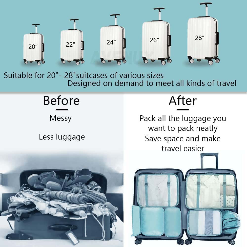 ✈ LUGGAGE COMPATIBILITY : Compatible with most travel bags, luggages, suitcases, backpacks, bagpacks, duffle bags. Can fit in 24-25 inch travel luggages. These packing organizers can make it easy for you to save space in your luggage/bag by classifying your belongings and keeping them from getting lost. This also makes security checks at the airport quick and convenient.