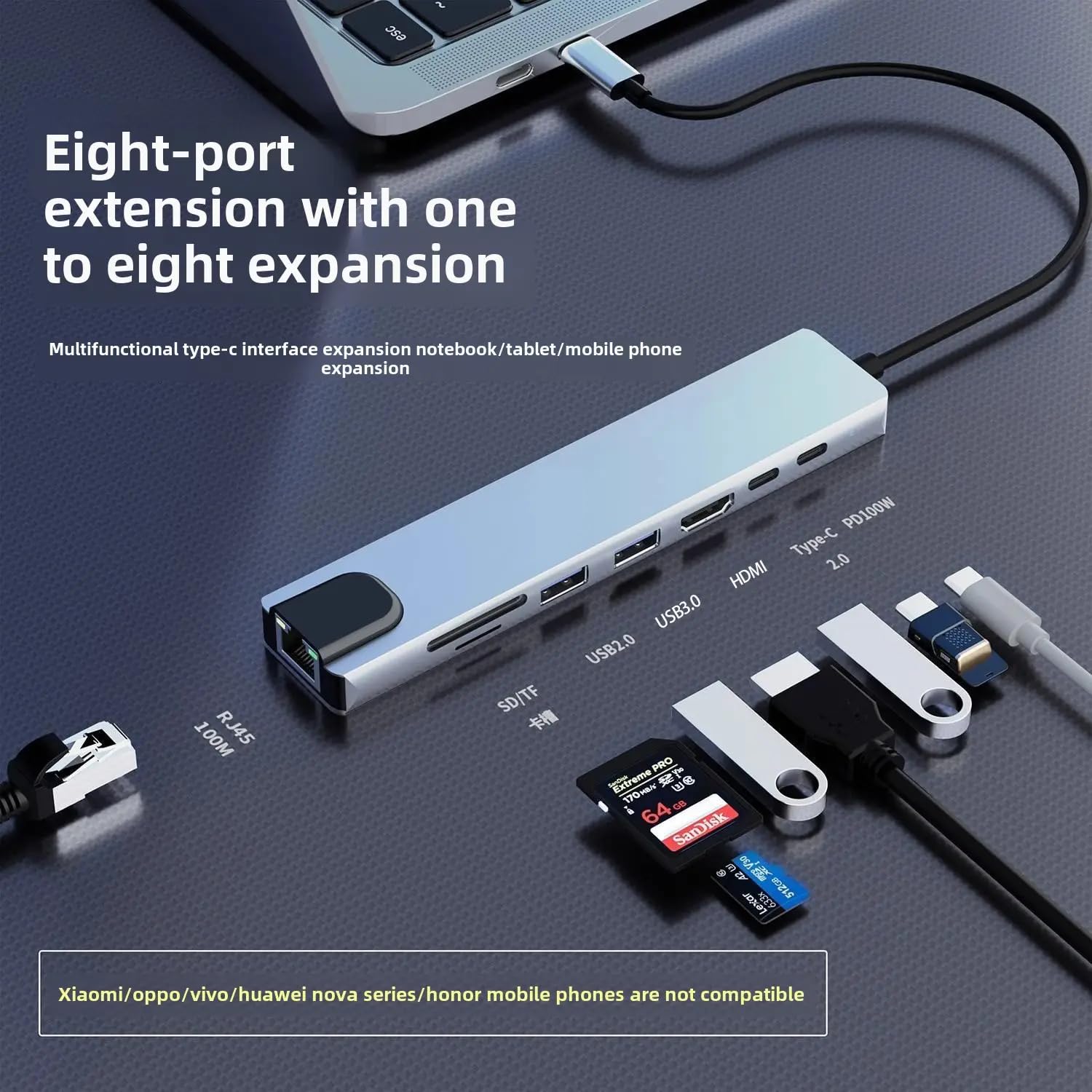 VERSATILE CONNECTIVITY: 8-in-1 USB-C hub featuring HDMI port, multiple USB ports, SD/TF card readers, and Type-C PD charging port for comprehensive device connectivity