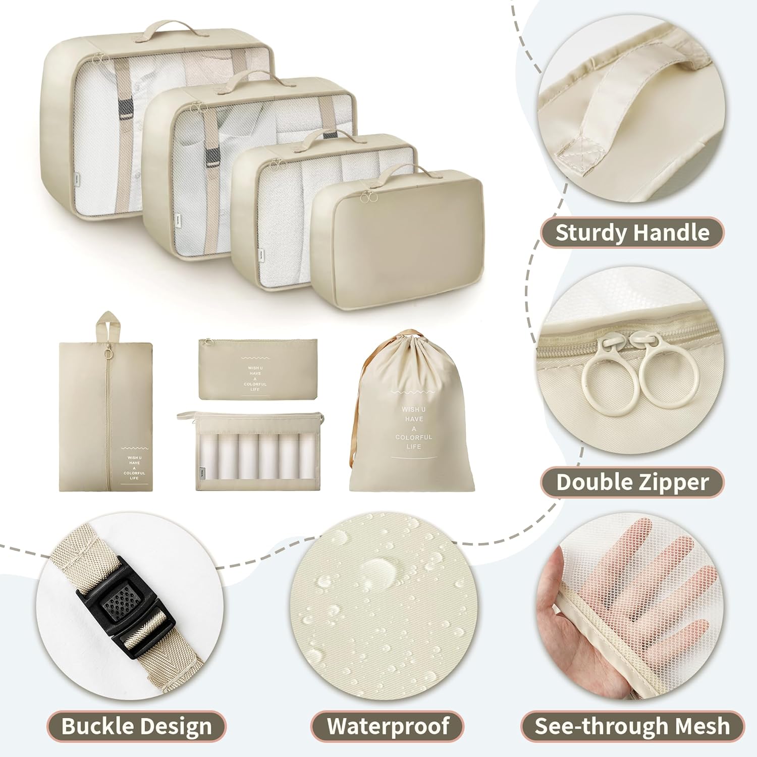 All the compact suitcase organizer cubes can be folded and stored in the largest one, and only a small space in your wardrobe is needed to be ready for your next trip. If you are not satisfied with our packing cubes for suitcases, or in the unlikely case of defects, please contact the seller immediately for replacement. Please don’t worry. We will do our best to solve any problem you may have with any of our products