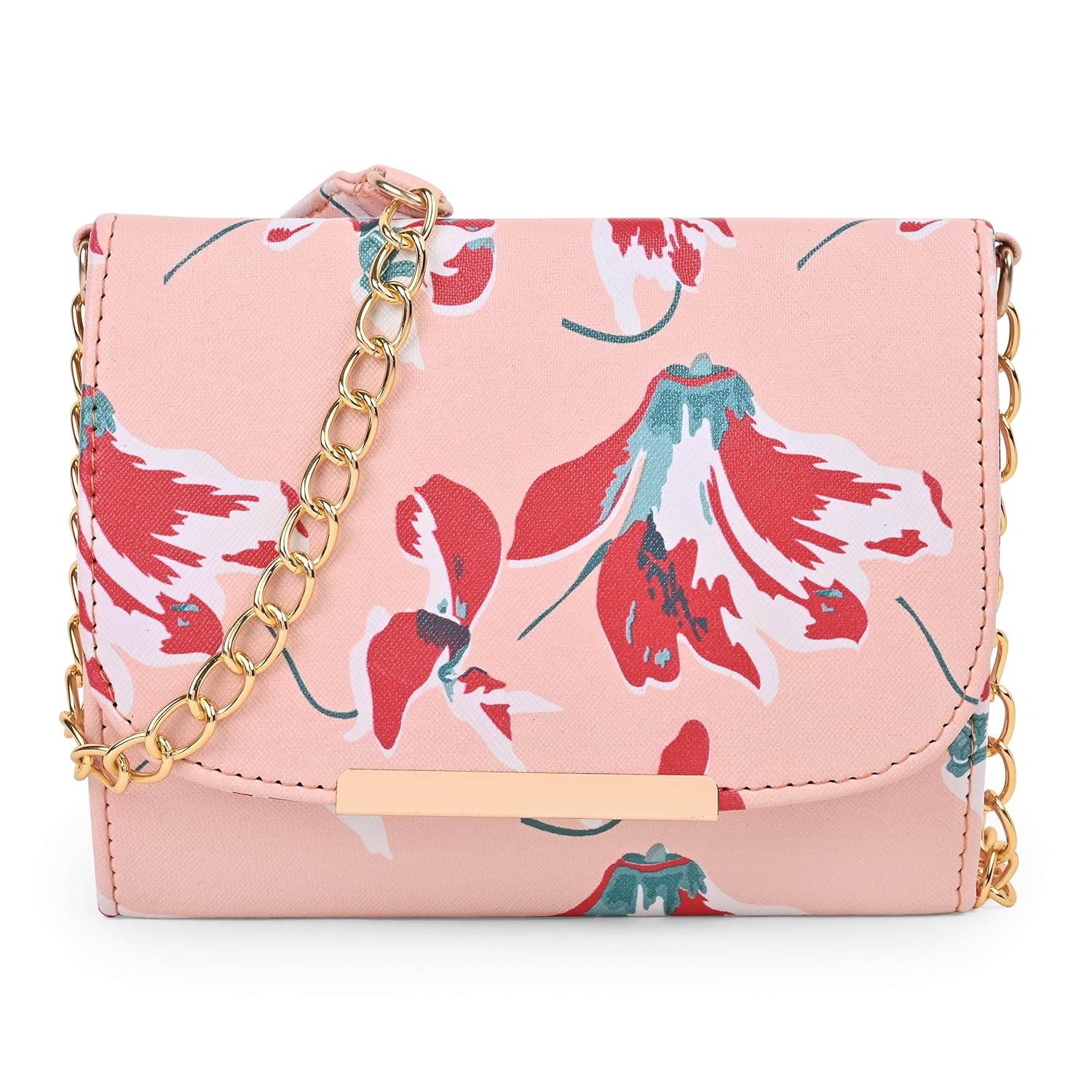 Floral print box sling bag made with high quality PU with magnetic button closure under the flap. The sling belt is made in combination of PU and Gold Chain. Inside it has 2 compartments divided with a fabric zipper pocket. This is a new and fresh design which is trending in the current fashion season. All features of the bag given in bullet points. A classy and stylish sling perfect for parties and clubbing, or for casual daily use.