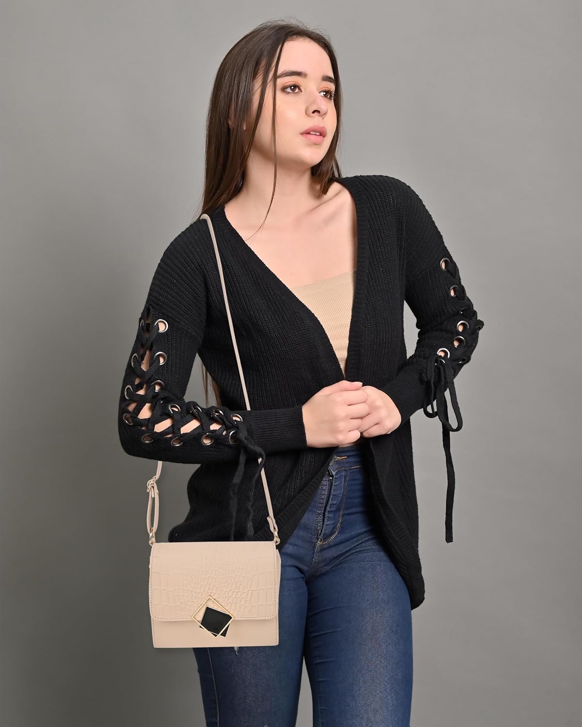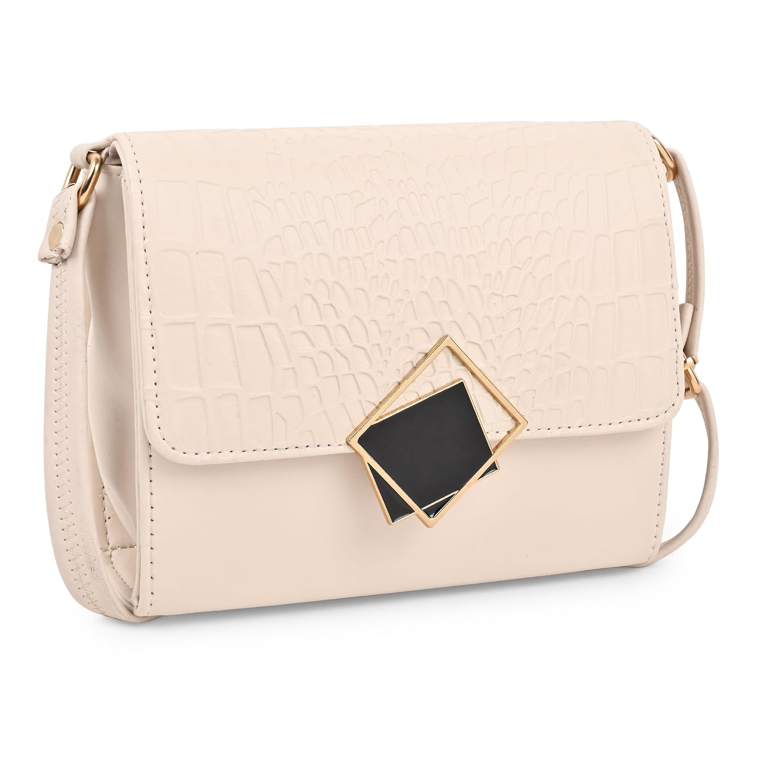 Box sling bag made with high quality PU with fancy show fitting on the front. The sling belt is a full length PU belt which is height adjustable. Inside it has 1 main compartment for convenience of storing your essentials with ease and without any hassle. This is a new and fresh design which is trending in the current fashion season. A classy and stylish sling perfect for parties and clubbing, or for casual daily use.