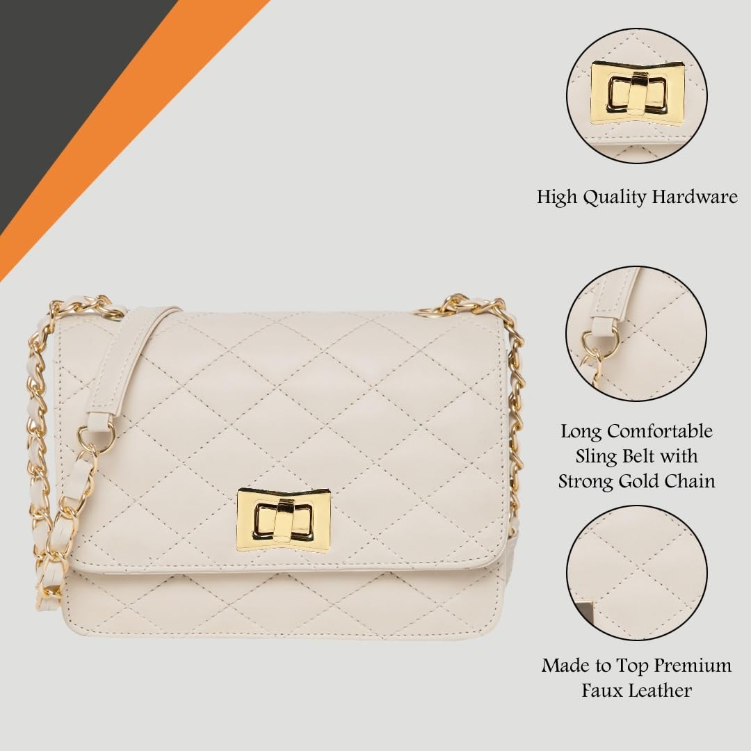 Quilted sling bag with quilted flap to be closed with a gold colored twist lock. Its belt is a combo of metal chain as well as PU. This is one of the most stylish and popular design of sling bags, suitable for both young girls and women. Stylish sling perfect for parties and clubbing, or for casual daily use.