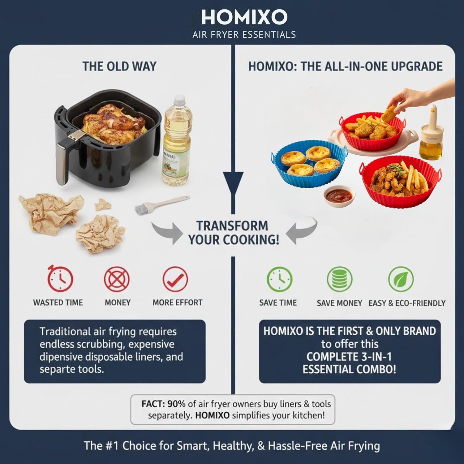 2️⃣ Keeps Your Air Fryer 100% Clean – No More Scrubbing Features a 1.5× higher raised edge that prevents oil splashes and food sticking to the air fryer basket. Keeps your fryer clean, scratch-free, and grease-free, saving time on cleaning. Fully dishwasher safe.