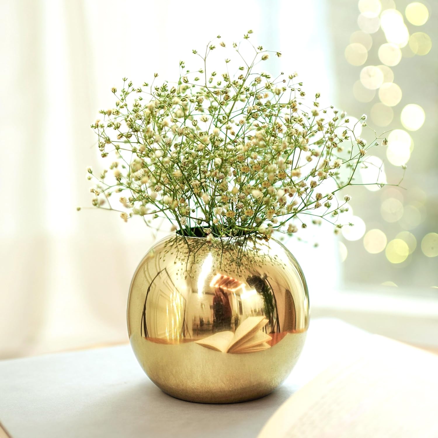 Versatile Display Options: This Gold ball vase set featuring a shiny mirrored finish is perfect for displaying your favorite flowers, foliage, or even standing alone as a captivating dcor piece. Beautiful metal vase, provides a luxurious and warm look for any house or office. It effortlessly complements both fresh and artificial arrangements.