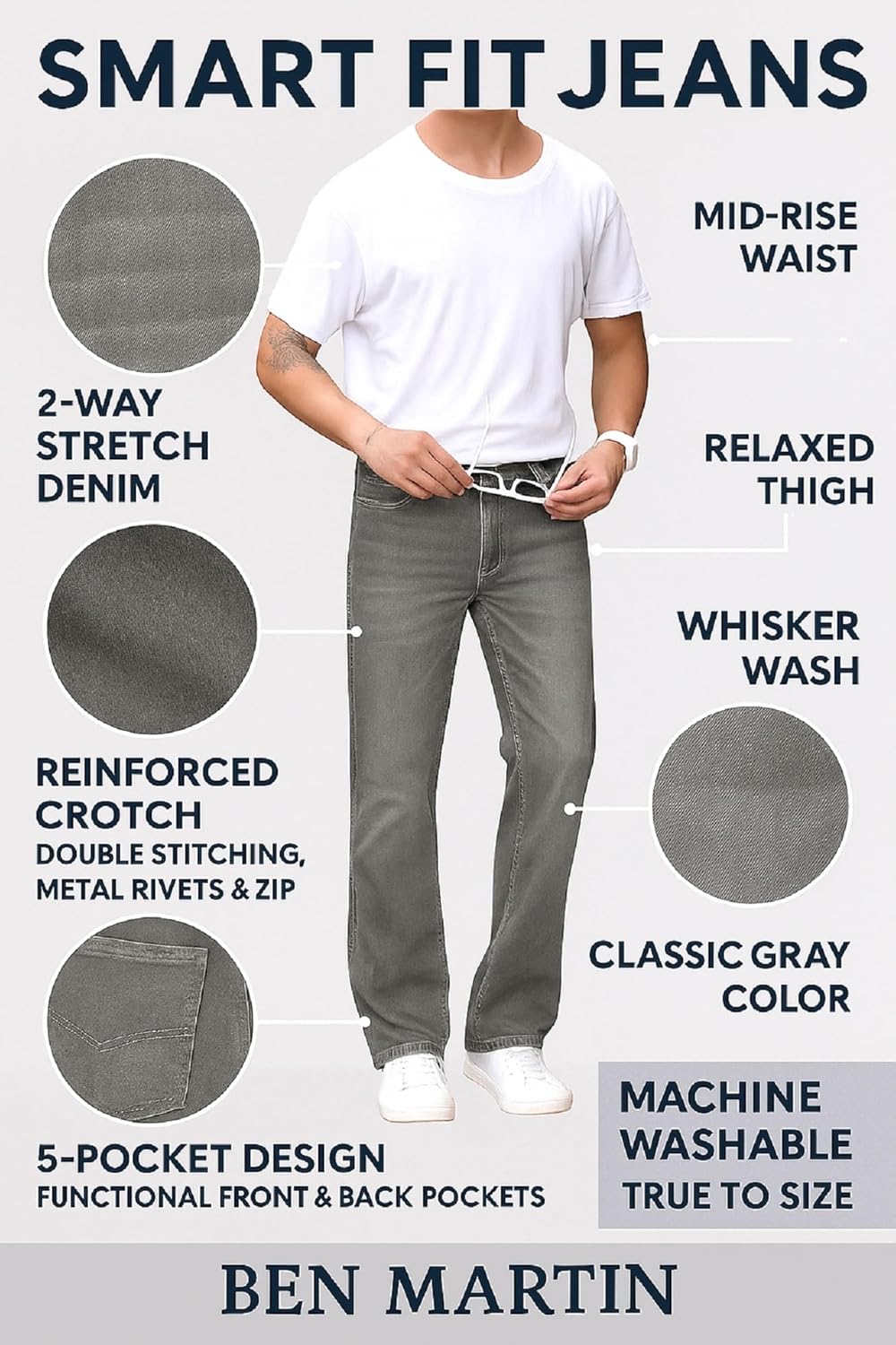 Experience the perfect blend of comfort, style, and performance with Ben Martin Smart Fit Stretchable Jeans for Men. Designed to complement the Indian body type, these jeans feature a modern smart fit—offering a slim look without feeling tight. The fabric’s 2-way stretch ensures easy movement, whether you’re at work, college, or out with friends. Crafted from premium cotton denim, the jeans are breathable, soft, and durable enough for daily wear.