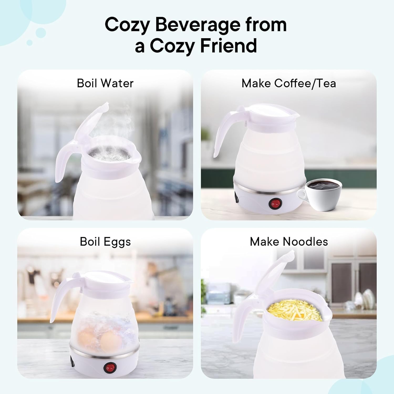 Electric-Powered & Fast Heating: Plug it in, switch it on, and you’ve got boiling water in minutes. This Silicone Kettle works like magic (but it’s just smart engineering).