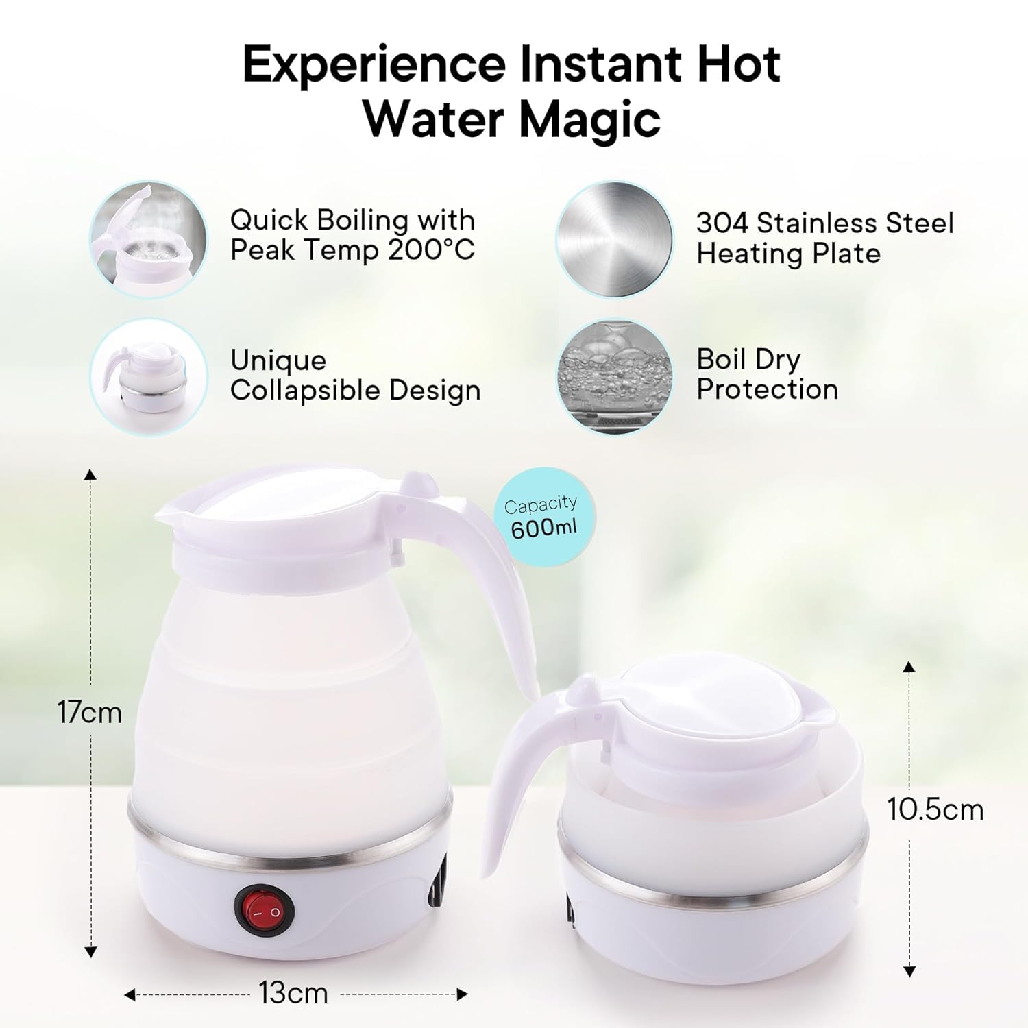 Collapsible & Portable: With a 172mm full height and collapsible down to just 97mm, this Silicone Kettle fits right into your backpack, suitcase, or even a desk drawer