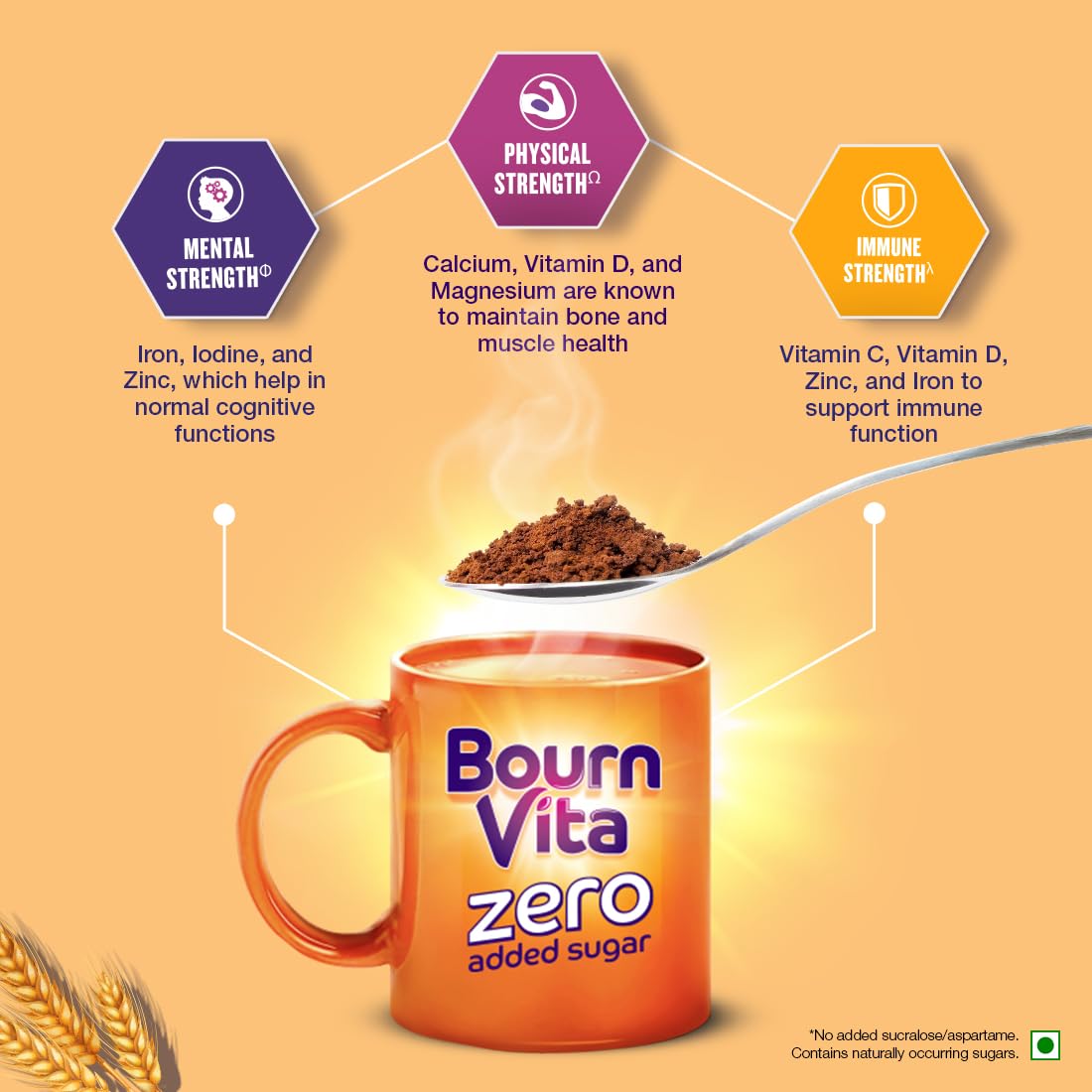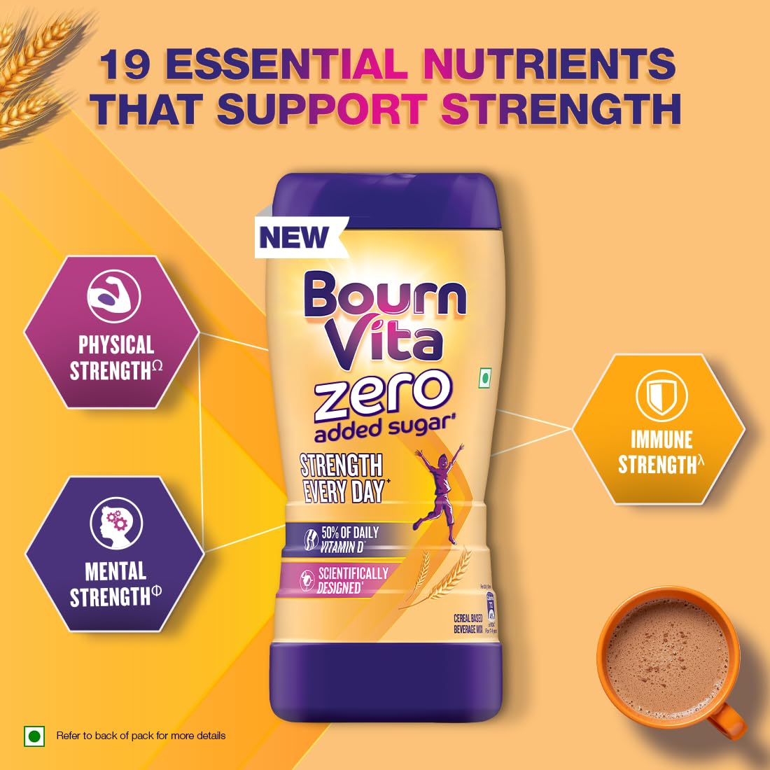 Bournvita Zero Added Sugar is a chocolate Nutrition Drink with 19 essential nutrients that support “Strength Every Day”. It is a scientifically designed formula, crafted by nutritionists with nutrients that are known to support Physical strength (Calcium, Vitamin D and Magnesium); Mental Strength (Iron, Iodine and Zinc) and Immune strength (Vitamin C, Vitamin D, Zinc and Iron). The product has no added sugar, preservatives or added sweeteners like sucralose/aspartame – it contains naturally occuring sugars.