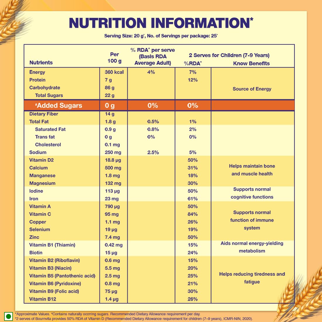 2 serves of Bournvita Zero Added Sugar provide 50% RDA of Vitamin D, Iron & Zinc (Recommended Dietary Allowance requirement for children (7-9 years), ICMR -NIN, 2020).