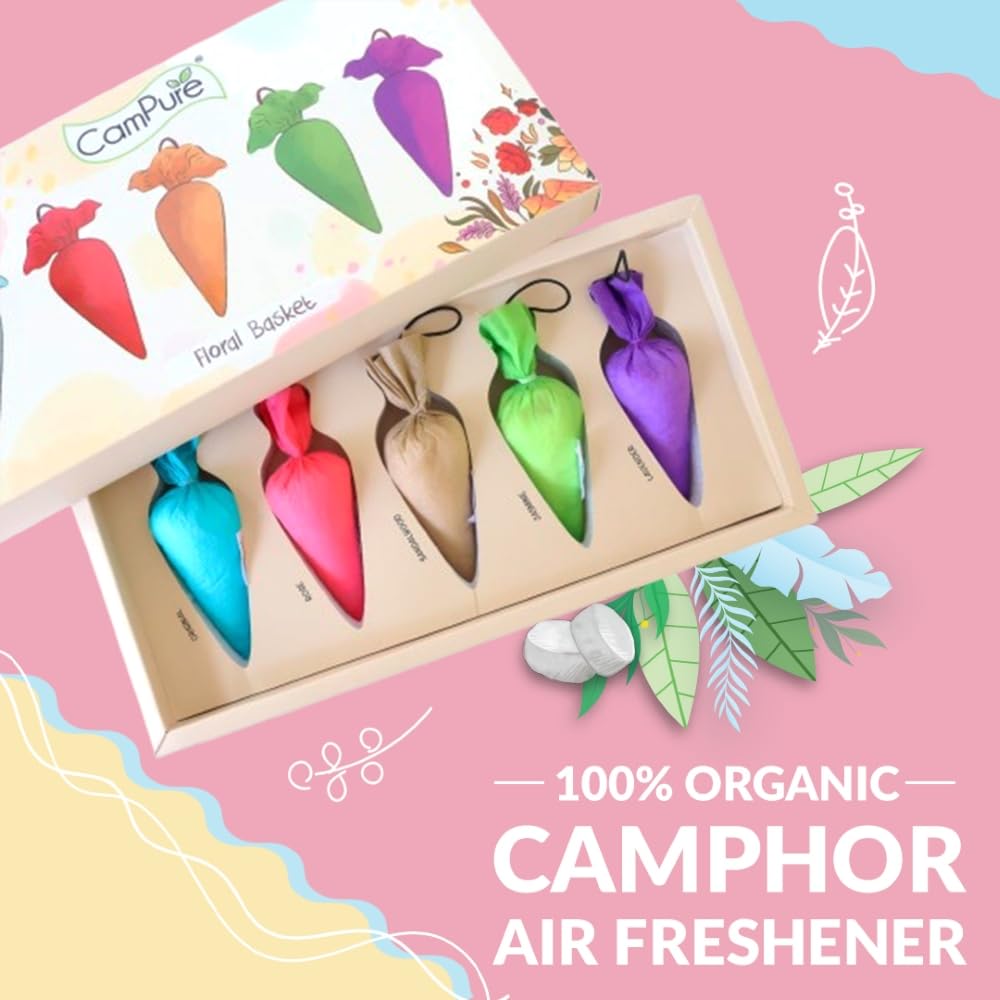 CamPure Floral Basket Gift Box – 5 Camphor Cones – 100% Organic | Air Freshener for Car, Wardrobe, Office Cabin’s, Drawers, Travel Bag & Bathroom