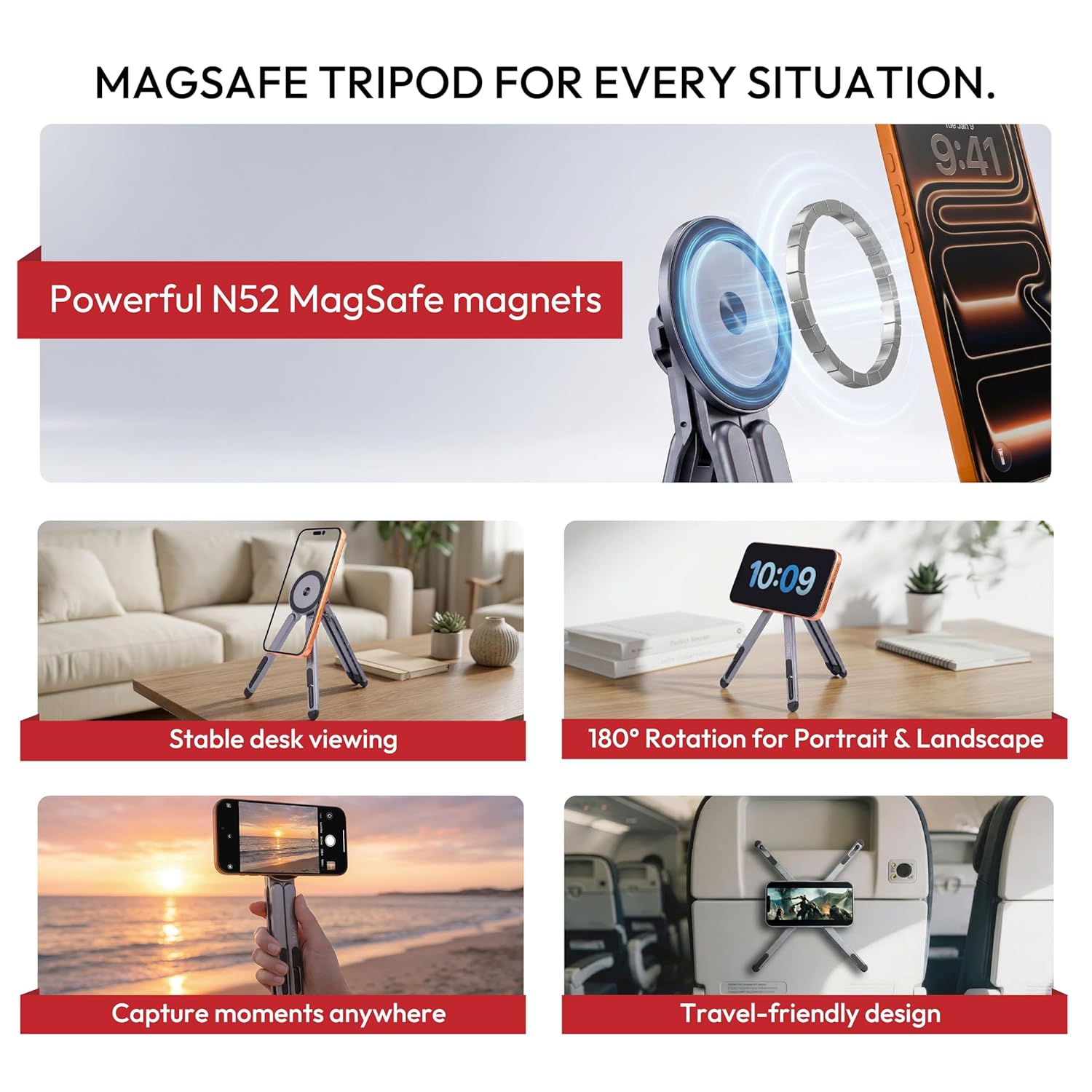 Upgrade your workspace and travel setup with the Maglock 3-in-1 Stand, a smart and versatile accessory designed for modern professionals and content creators. This innovative stand combines a laptop stand, tablet stand, and extendable selfie stick in one compact device, making it perfect for work, video calls, streaming, and travel. The built-in magnetic lock with Mag-Safe compatibility ensures a secure and stable hold for your device while allowing quick attachment and removal. Its 8-level spring-loaded height adjustment lets you easily find the perfect viewing angle, helping improve posture and reduce neck and back strain during long working hours. Weighing only 150g, the Maglock stand is ultra-light, pocket-sized, and foldable, making it ideal for people who work on the go. Whether you’re working from a café, attending online meetings, or capturing content, this stand provides maximum convenience without adding bulk to your bag. The stand also features a selfie stick mode, allowing you to extend it for photos, videos, and live streaming. With its professional ergonomic design, it offers both stability and comfort for daily use.