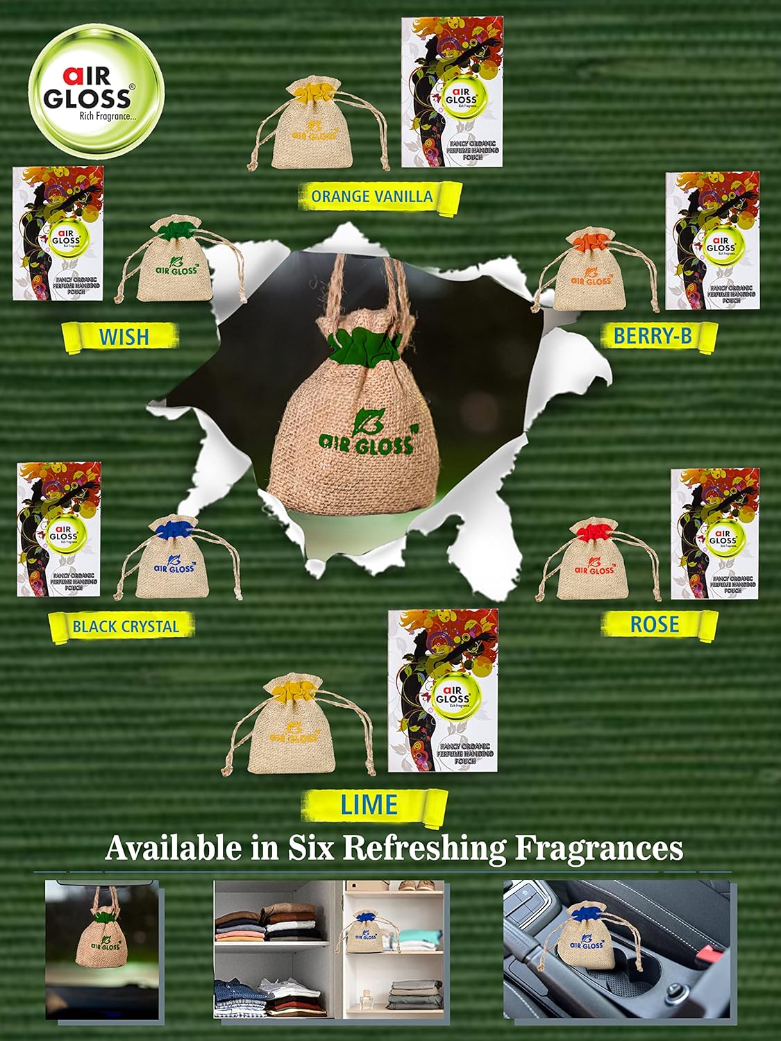 Enhance the ambiance of your space with Air Gloss Jute Hanging Freshener, which comes in a variety of fragrances including Wish, Lime, Rose, Berry-B, Black Crystal, and Orange Vanilla to suit your preference.