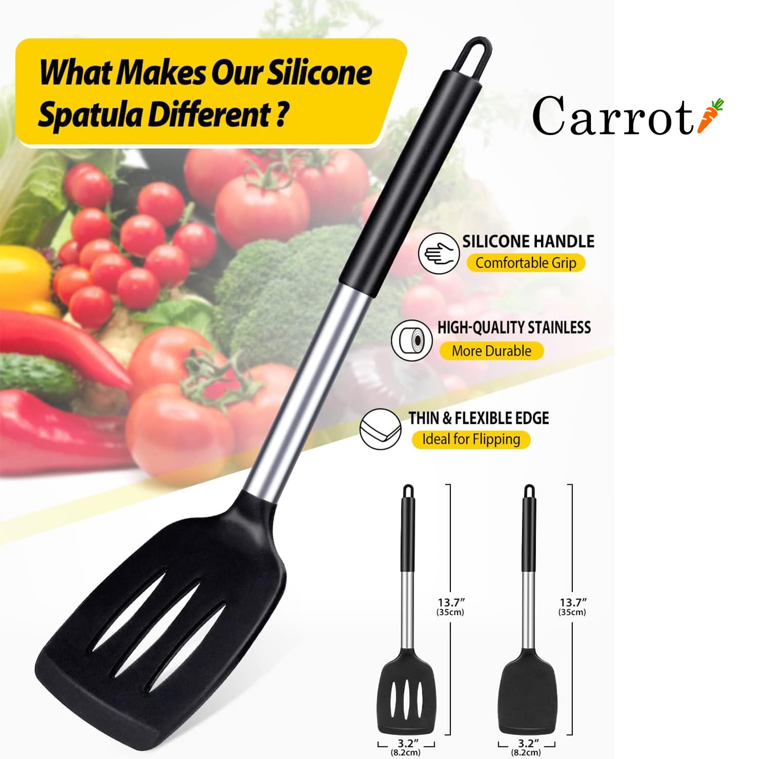 MORE SAFE AND HEALTHY: Unlike other ordinary sellers, we pay more attention to the safety of product materials.Our silicone spatula are made of food-grade silicone, free of BPA. Even at high temperatures of 446℉ (230℃), there is no need to worry about melting or deforming. At the same time, the soft silicone won’t scratch the coating, which can better protect your pot. THE MOST THOUGHTFUL DESIGN: The high-quality 18/8 stainless steel is more durable and keeps you away from the trouble of kitchen utensils rusting or breaking. The anti-scald silicone handle is not easy to conduct heat and is more comfortable to hold than traditional utensils. While you enjoy a happy cooking time, you can better protect your hands from being scalded. EASY TO CLEAN: After each use, just wipe with hot water, you can easily clean and remove excess fat and food.The design of the round hanging hole makes it easier to dry. JUST WANT TO PROVIDE THE BEST FOY YOU : Life comes from details. Carrot Kitchenware insists on controlling the details. The modern gray color can be freely matched with different kitchen styles. The soft food-grade silicone is designed for noise-free cooking. Thin and flexible edge,is ideal for flipping. Pack of Two Spatulas: You get a durable set of two spatulas, each measuring approximately 13 inches in length, for all your cooking and baking tasks in the kitchen.