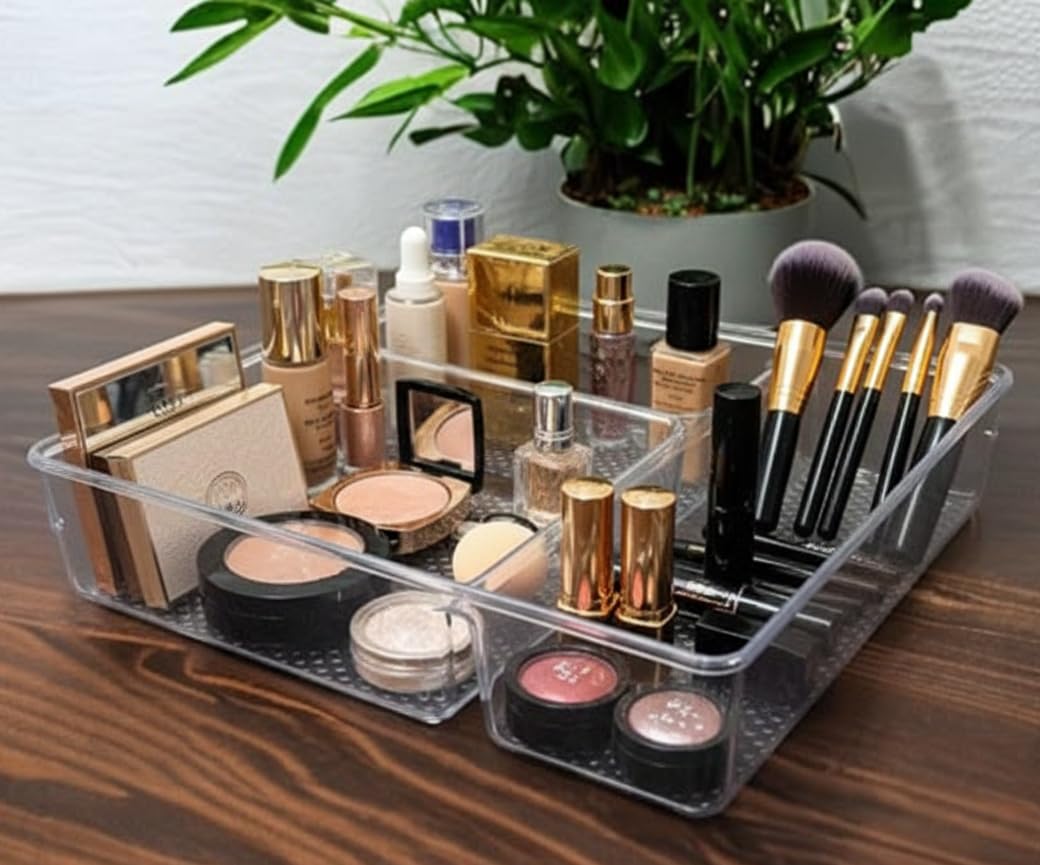 VERSATILE DESIGN: Clear plastic drawer organizer tray with 3 compartments, perfect for organizing bathroom essentials, kitchen utensils, office supplies, or bedroom accessories