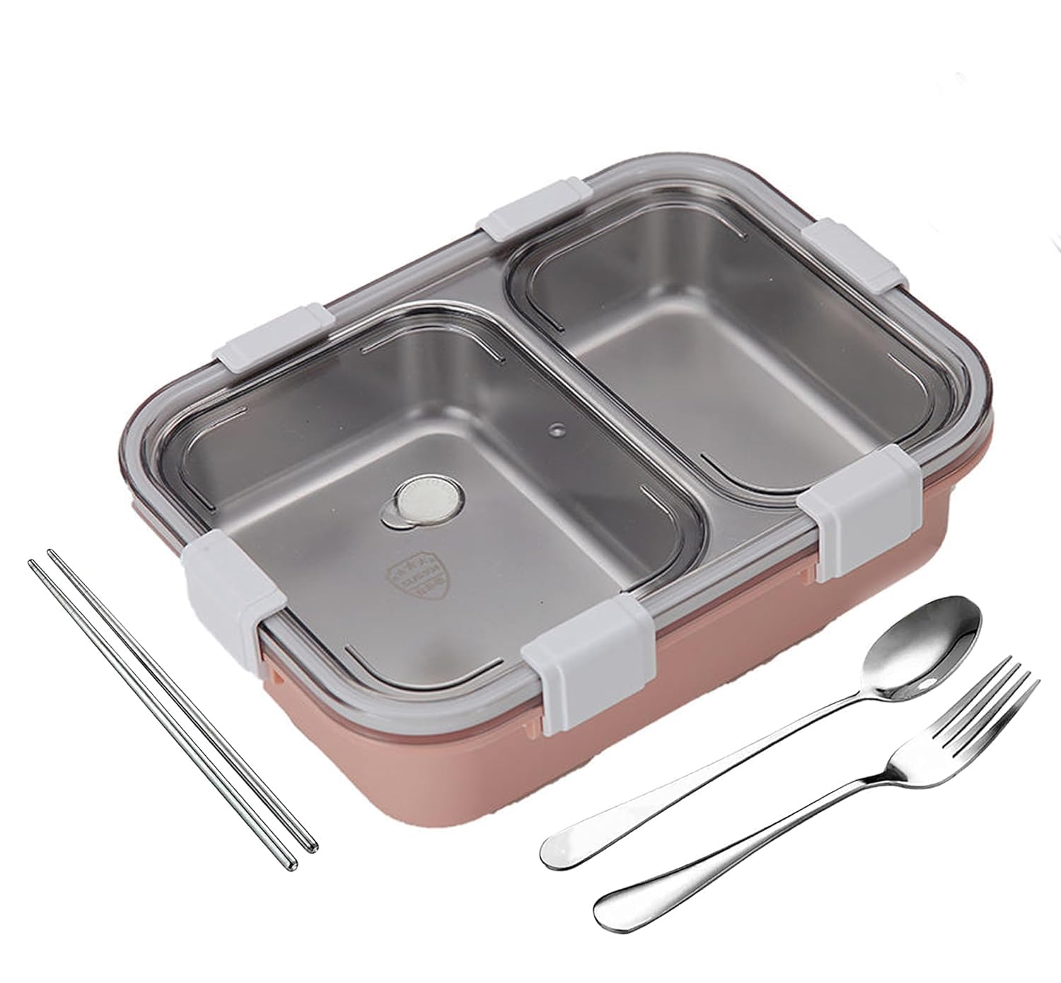 Upgrade your everyday meals with this Premium Stainless Steel Lunch Box, thoughtfully designed for convenience, hygiene, and style. Featuring a 2-compartment stainless steel inner tray, it allows you to pack different dishes such as rice, curry, vegetables, salads, or snacks separately, keeping flavors fresh and perfectly organized throughout the day.The lunch box is made with high-quality food-grade stainless steel that is rust-resistant, odor-free, and safe for daily use. Its BPA-free plastic outer body provides durability while remaining lightweight and easy to carry. The transparent airtight lid, combined with a silicone sealing ring and secure locking clips on all sides,making it suitable for carrying gravies and semi-liquid foods without any spills.Designed for modern lifestyles, the removable stainless steel tray is microwave-safe, allowing quick reheating of meals at home or at work. The compact and travel-friendly design fits effortlessly into office bags, school backpacks, and handbags, making it ideal for office professionals, students, and travelers.Adding to its practicality, this lunch box includes a complete stainless steel cutlery set with a spoon, fork, and chopsticks, so you are always ready to enjoy your meal anywhere. Finished in an elegant pink color with a modern look, this lunch box combines functionality with style, making it a perfect choice for everyday healthy eating on the go.