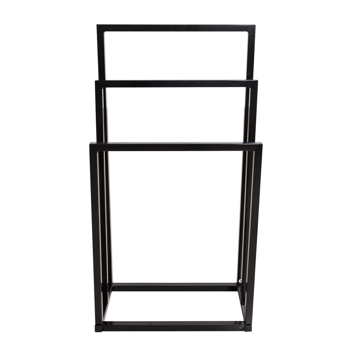 Bring organization, storage, and modern style to your bathroom with this convenient towel rack.This freestanding rack can be easily added to any bathroom to bring extra towel storage space This is a three-layer design towel rack for bathroom use, which can save more space in your bathroom. You can hang a large bath towel on the third layer and a face towel or paper towel on the two lower layers. The shiny black adds a sense of mystery to your bathroom. The product is made of sturdy Metal, sturdy and stable, without the trouble of shaking or moving.