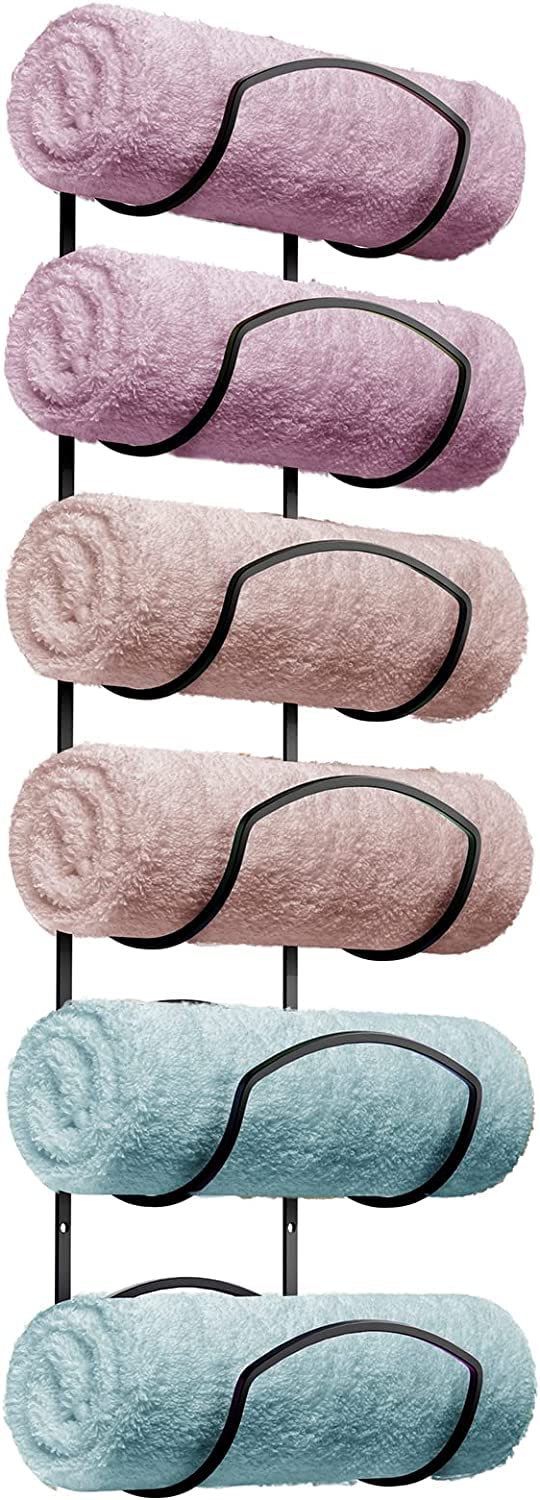 【3 Levels x 2pcs Towel Storage】 each towel rack has 3 compartments, provides total 6 rungs storage for organizing bath towel in one convenient place, and you can choose to assemble them together as one unit, or assemble them separately to meet your different requirement 【Towel Racks for Bathroom Wall】 wall mounted towel holder for bath towel, face towel, hand towel, guest towel, etc. Well organizing kinds of rolled up towels, convenient to use, optimize the storage space for small bathroom and save space in your bathroom or other places 【Multi-Purpose Storage Rack】 this curved storage rack features large space and elegant solid construction, it works as towel rack in bathroom, it can be used as rolling pin storage in kitchen, and also it works perfect as yoga mats holder. It is a multifunctional storage rack for you