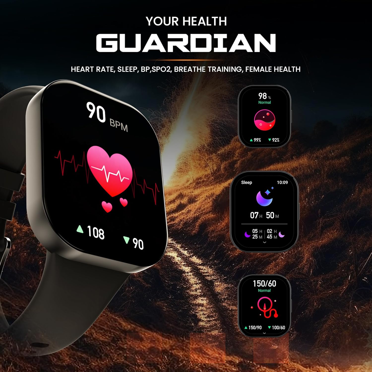Health Suite: 24/7 real time health monitoring feature in Hammer Robust allows you to keep track of Health parameters like Heart Rate, SpO2, and even you can monitor your sleep with sleep tracking directly from your watch and mobile phone, female menstrual cycle tracking helps you to be stress-free always, we make sure that nothing comes between you and your health