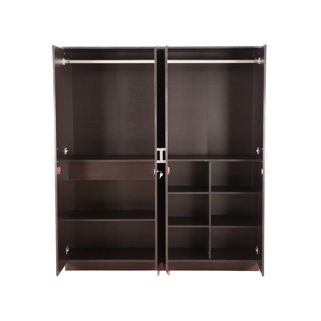 Construction:- The wardrobe has hinged doors The hanger pole is installed at an ergonomic height for easy accessibility of hangers The oval shape allows the hangers to twist on the pole easily . Oval poles are also stronger due to their weight bearing capacity. The drawer is mounted on telescopic channels. These channels provide full accessibility to the storage space. All doors are fitted with locks that come with metal keys.
