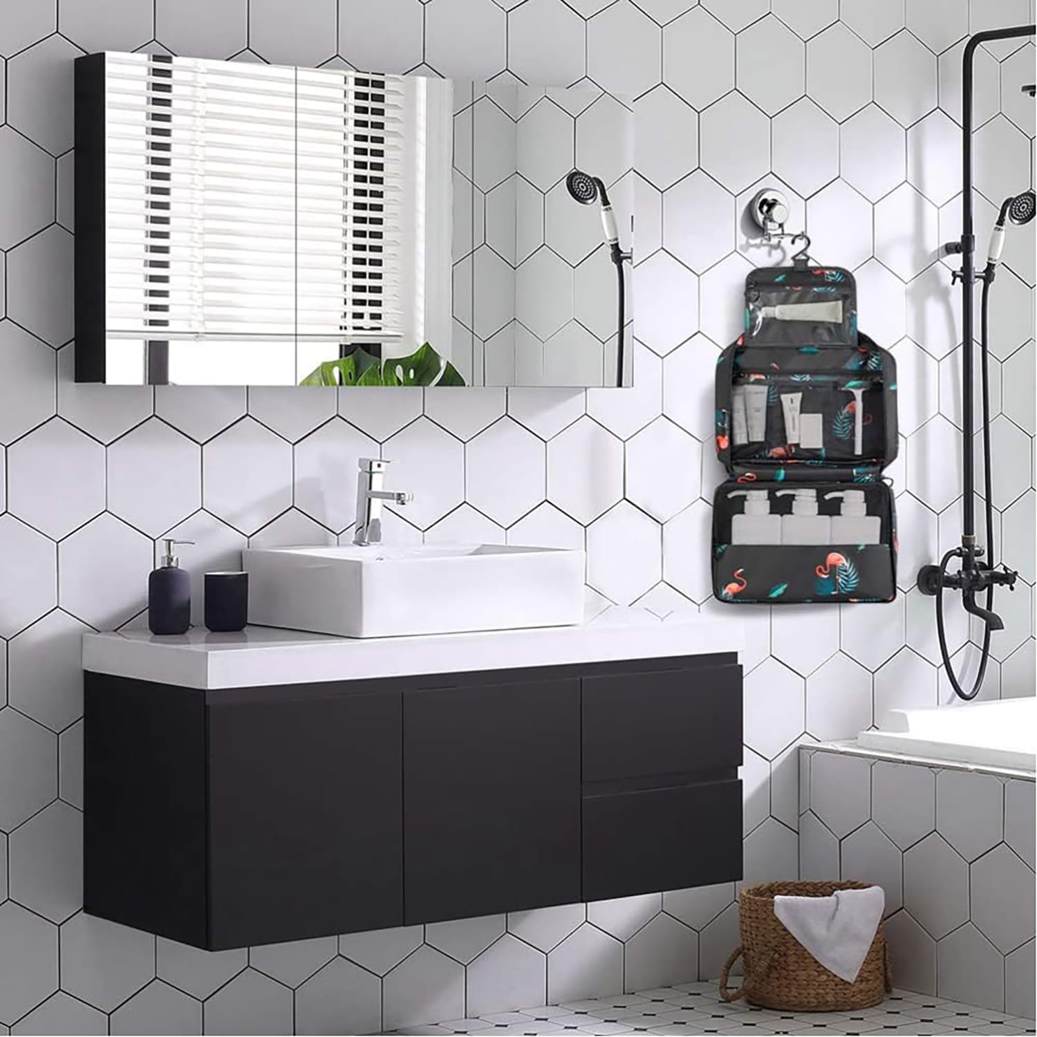 SMART HANGING HOOK – Buit-in hook allows hanging the toiletry kit from towel rack, coat hook or whereever is available, making your toiletries and cosmetics displayed well for easy access and saves counter space as well