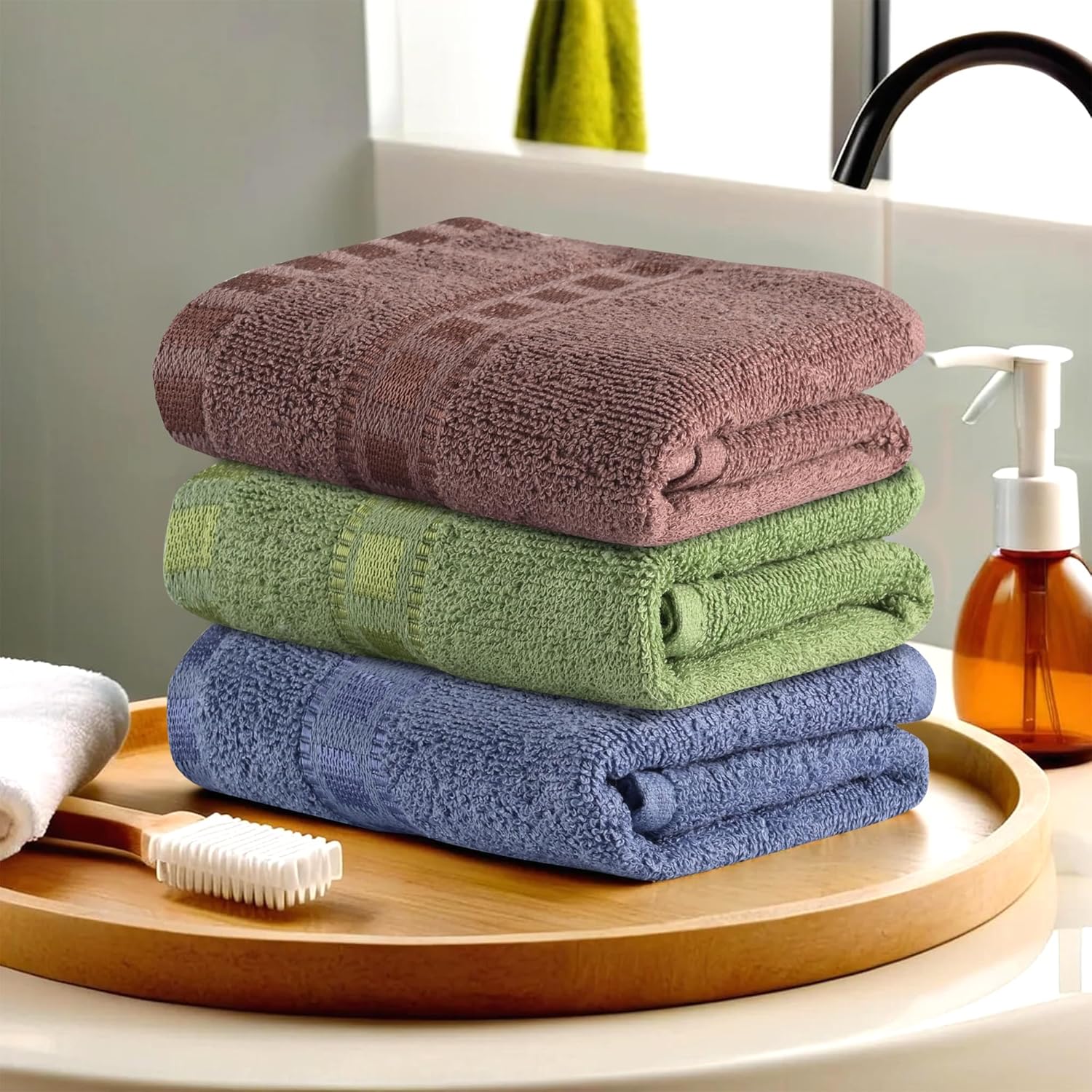 ✅ Package Contains – 3 Piece Face Towel | Check Border | Color – Dark Blue-Green & Brown | Material – Cotton | Product Dimensions – 53 cm x 35 cm x 1 cm