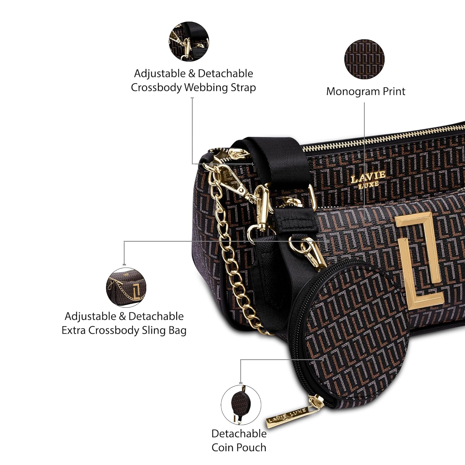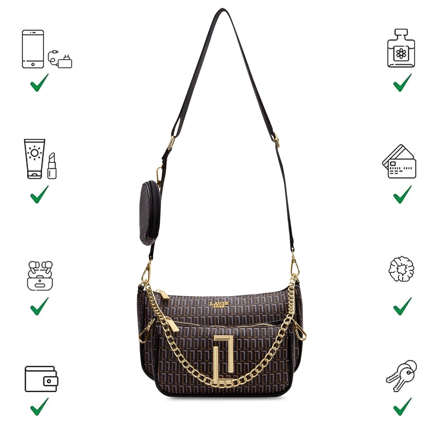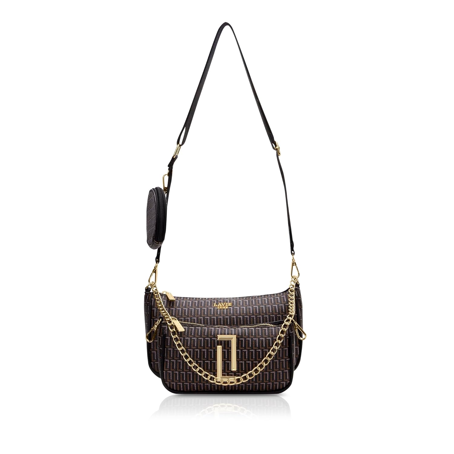 A fashion faithful idea for a classy appeal, this women’s multi pouch sling bag from Lavie Luxe will definitely grab all the attention anywhere you go. Monogram printing and metallic hardware detailing gives this multifunctional bag a strong back to reserve a seat in your wardrobe. This stunning sling will perfectly match any outfit in a chic and classic way!