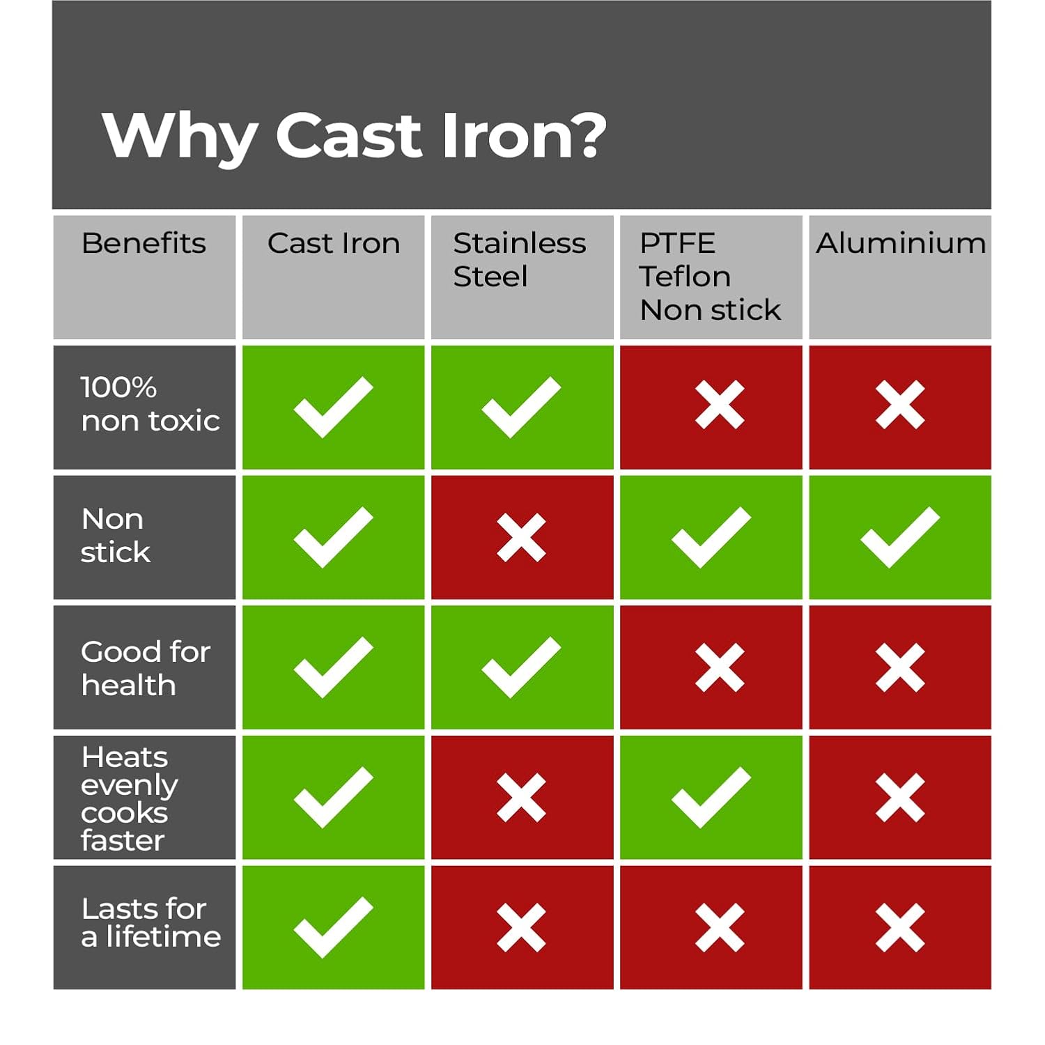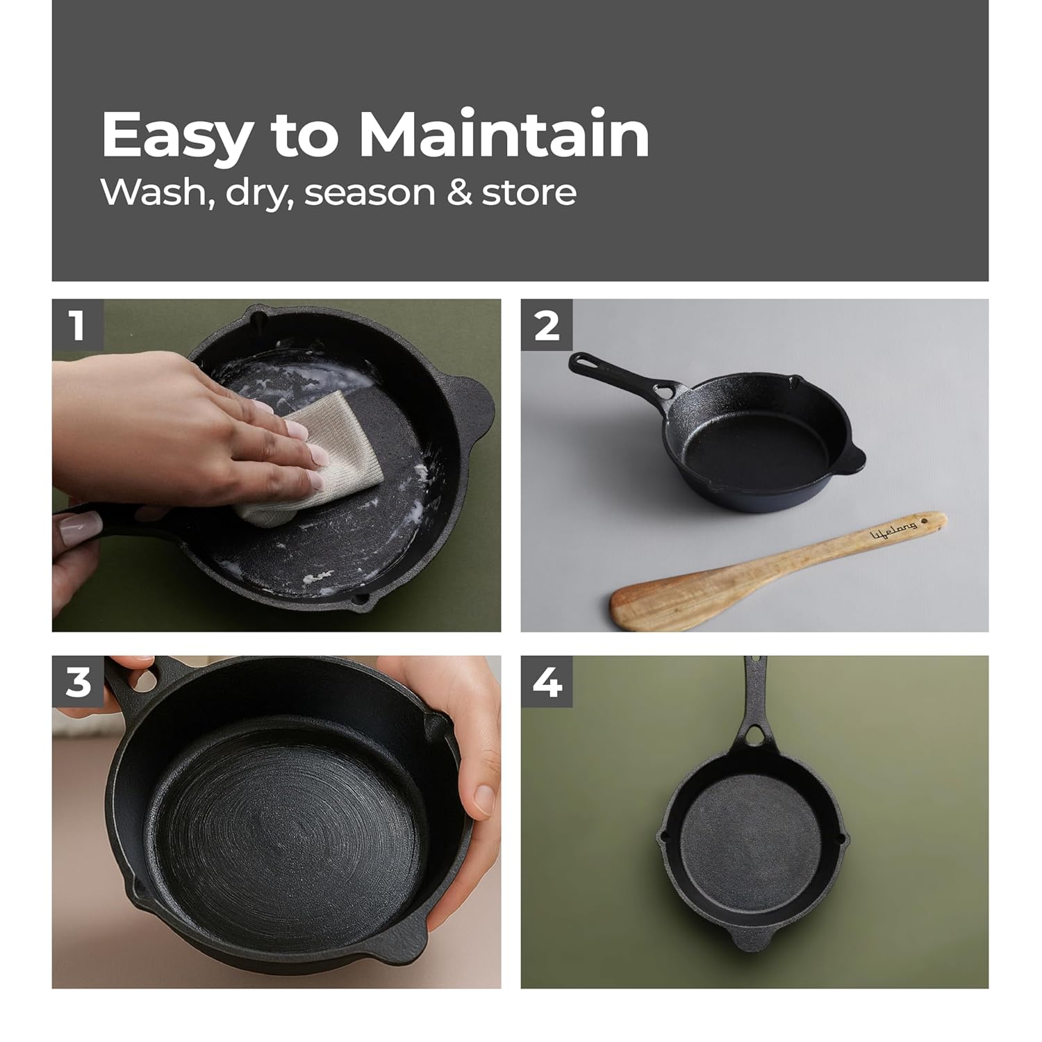 Made from high-quality cast iron, the Lifelong Cast Iron Skillet Pan is designed to last through daily use for years to come. This durable pan offers long-lasting strength and cooking performance, while its surface improves with regular use, becoming easier to cook on.