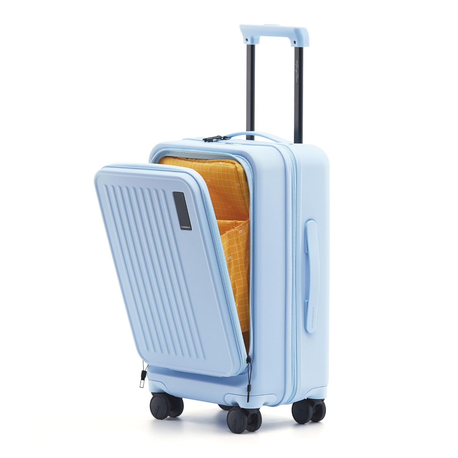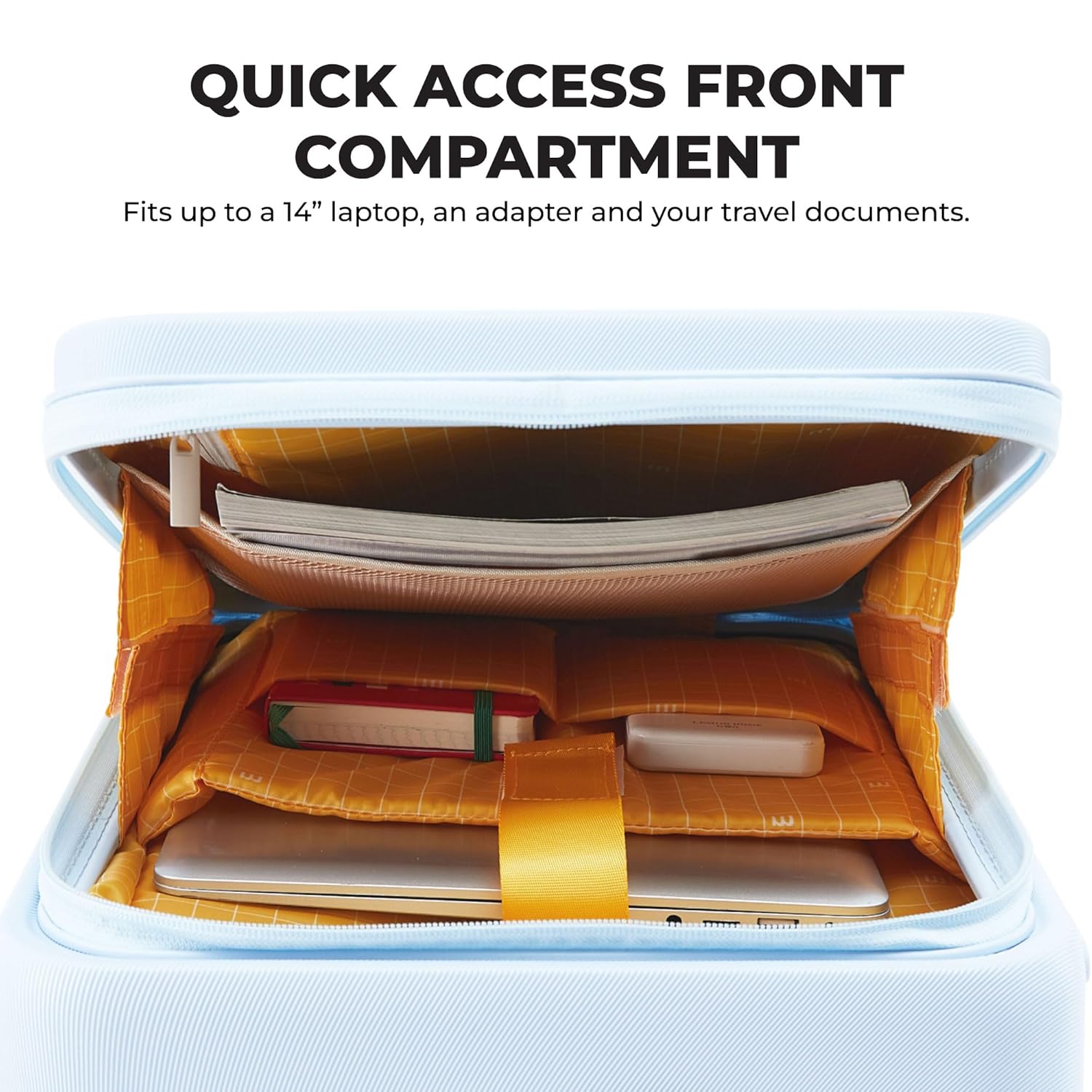 OPTIMISED ORGANISATION: front tech compartment fits up to a 14” laptop. Lets you access your tech faster and breeze through airport security checks. Featuring two zippered storage compartments, this luggage maximizes packing efficiency and organization, accommodating essentials for a 5-7 day trip with its spacious 40-litre capacity.