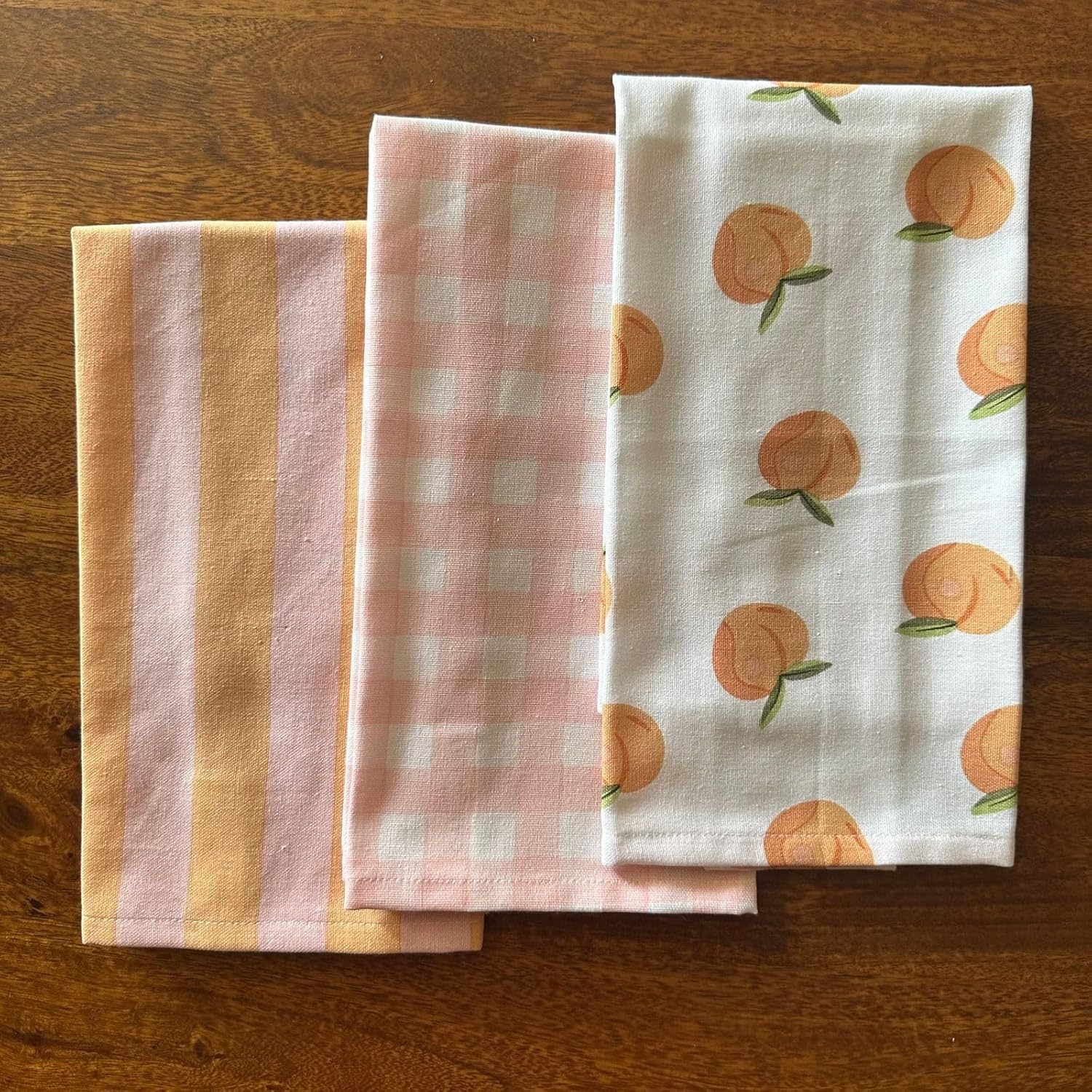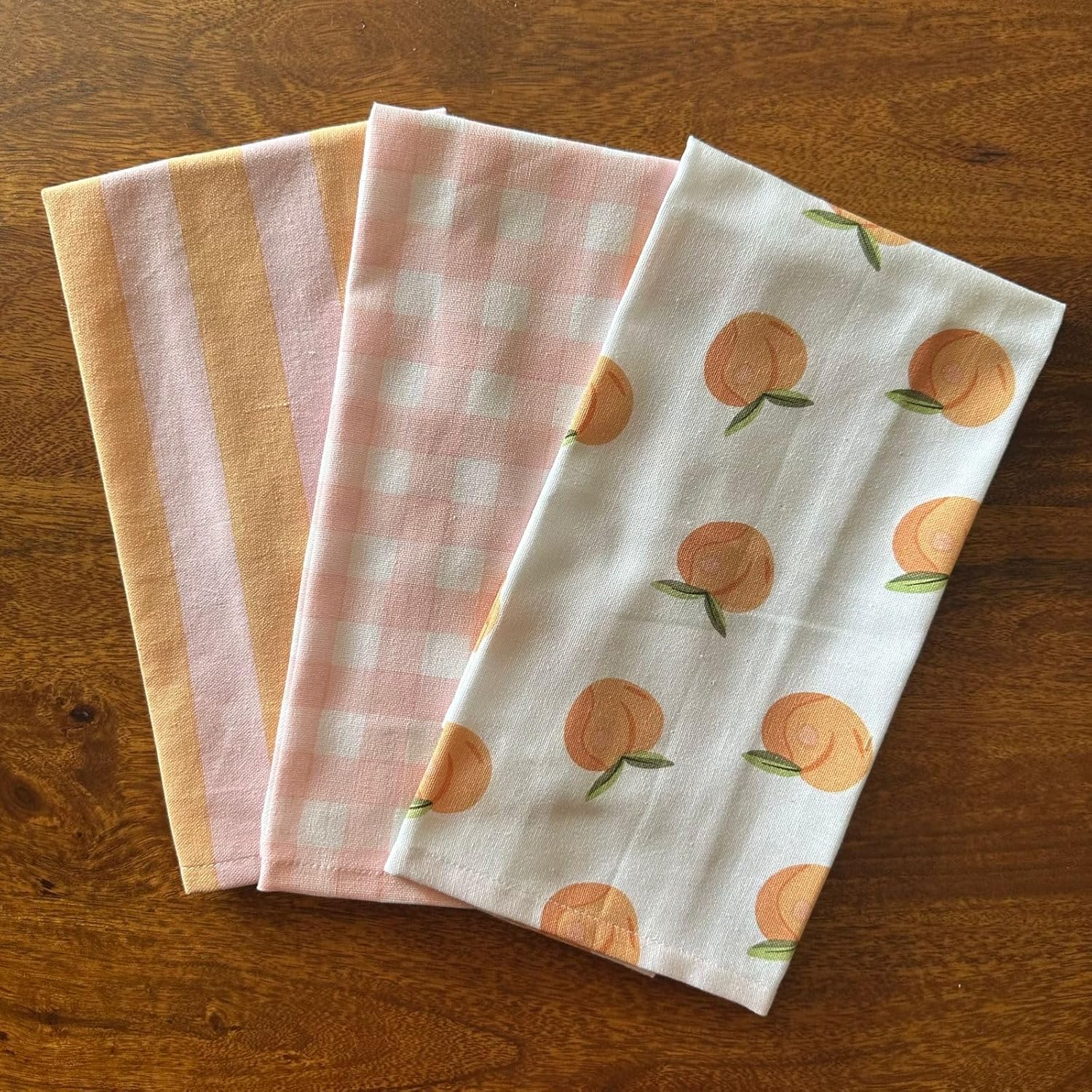 Variety of Designs: Set includes 3 charming kitchen towels in unique designs of fruity peach, pink check and fashionable stripes patterns – adding a touch of charm and style to your kitchen decor.