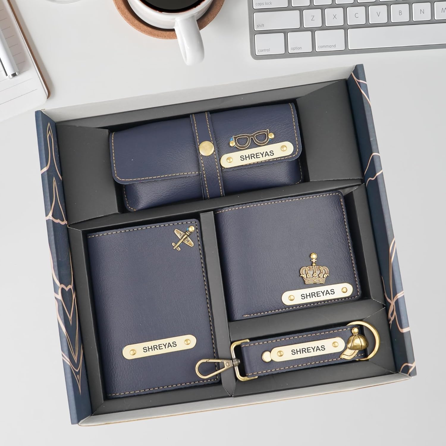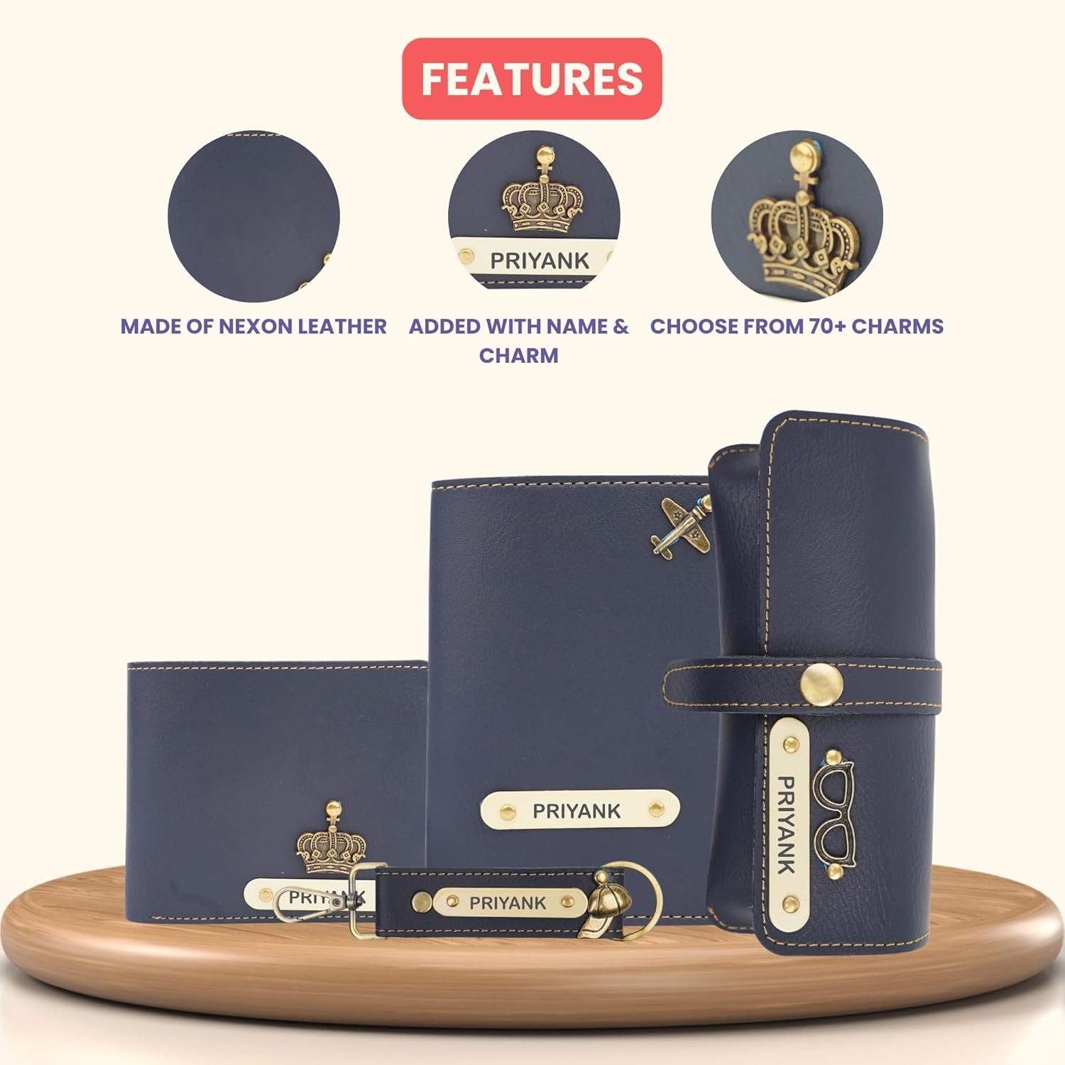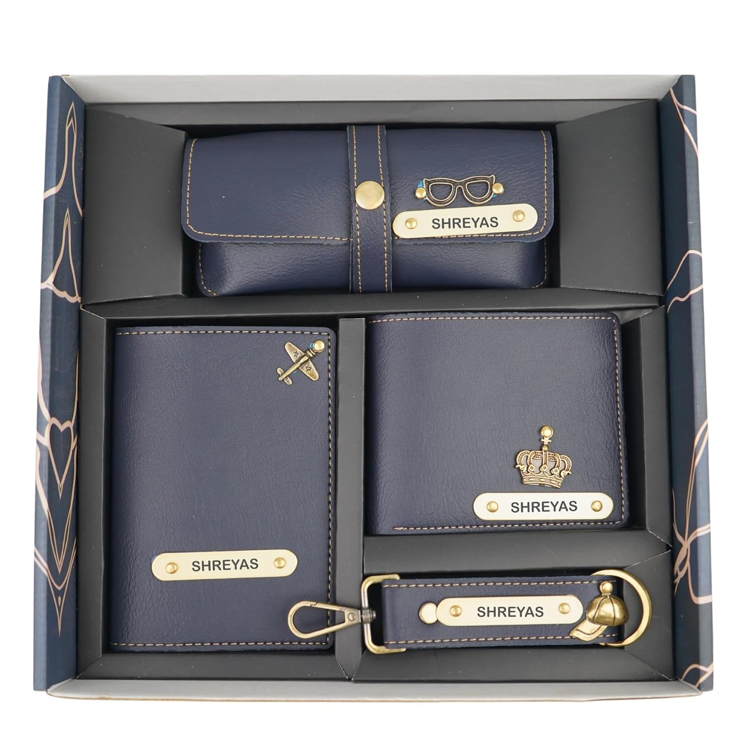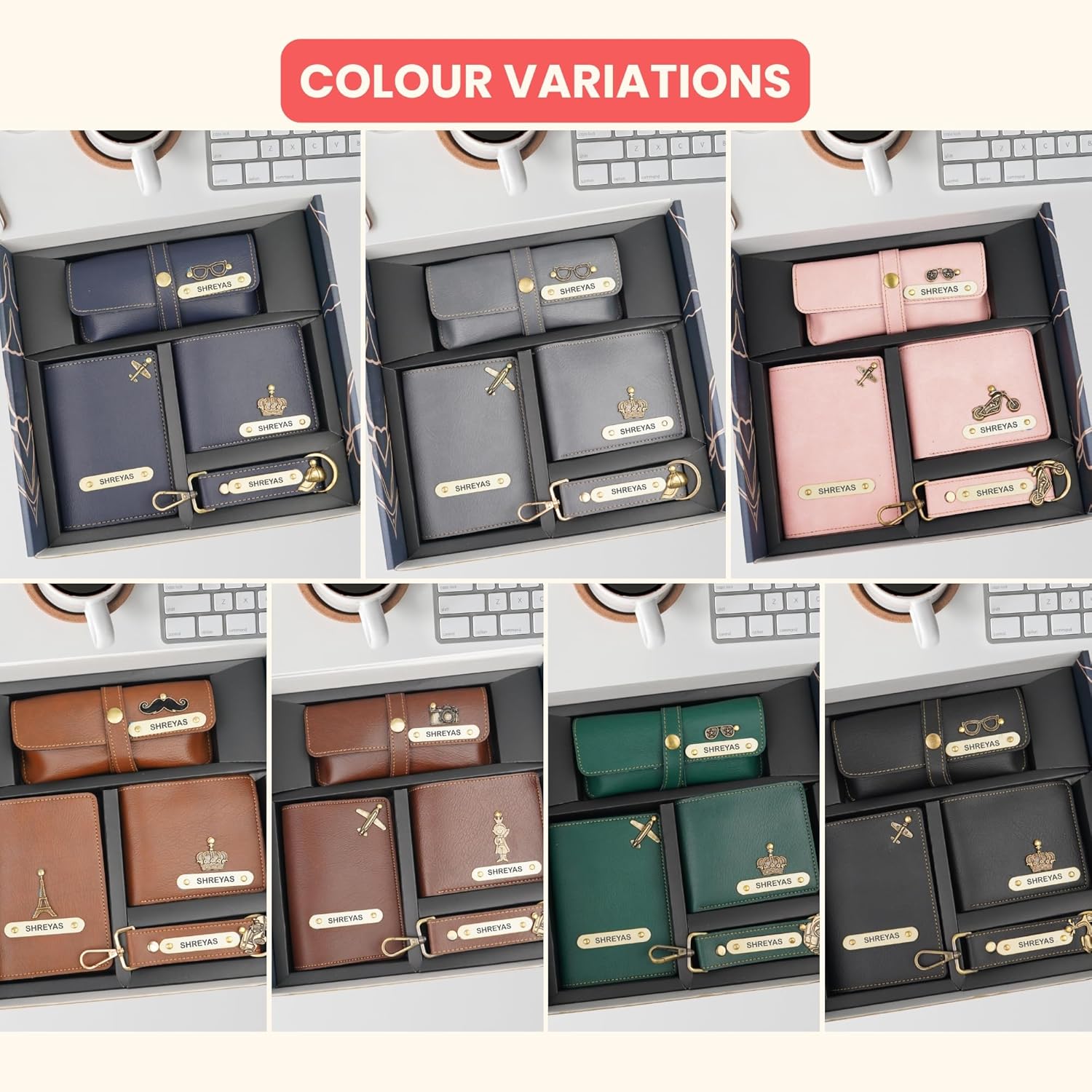 Personalised Gifts for Men in 7 Stylish Colors: This 4-piece set includes a leather wallet, eyewear case, passport cover, and keychain, all customized with name and charm. Available in 7 color variations, this set makes the perfect personalised gifts for men that are both practical and stylish.