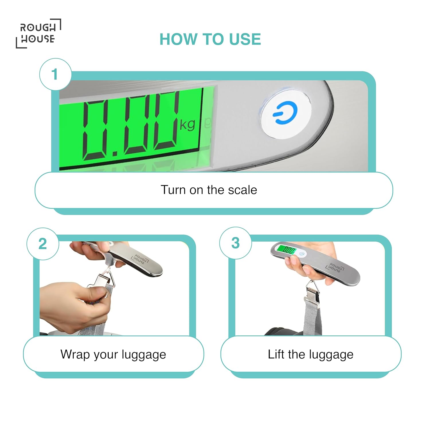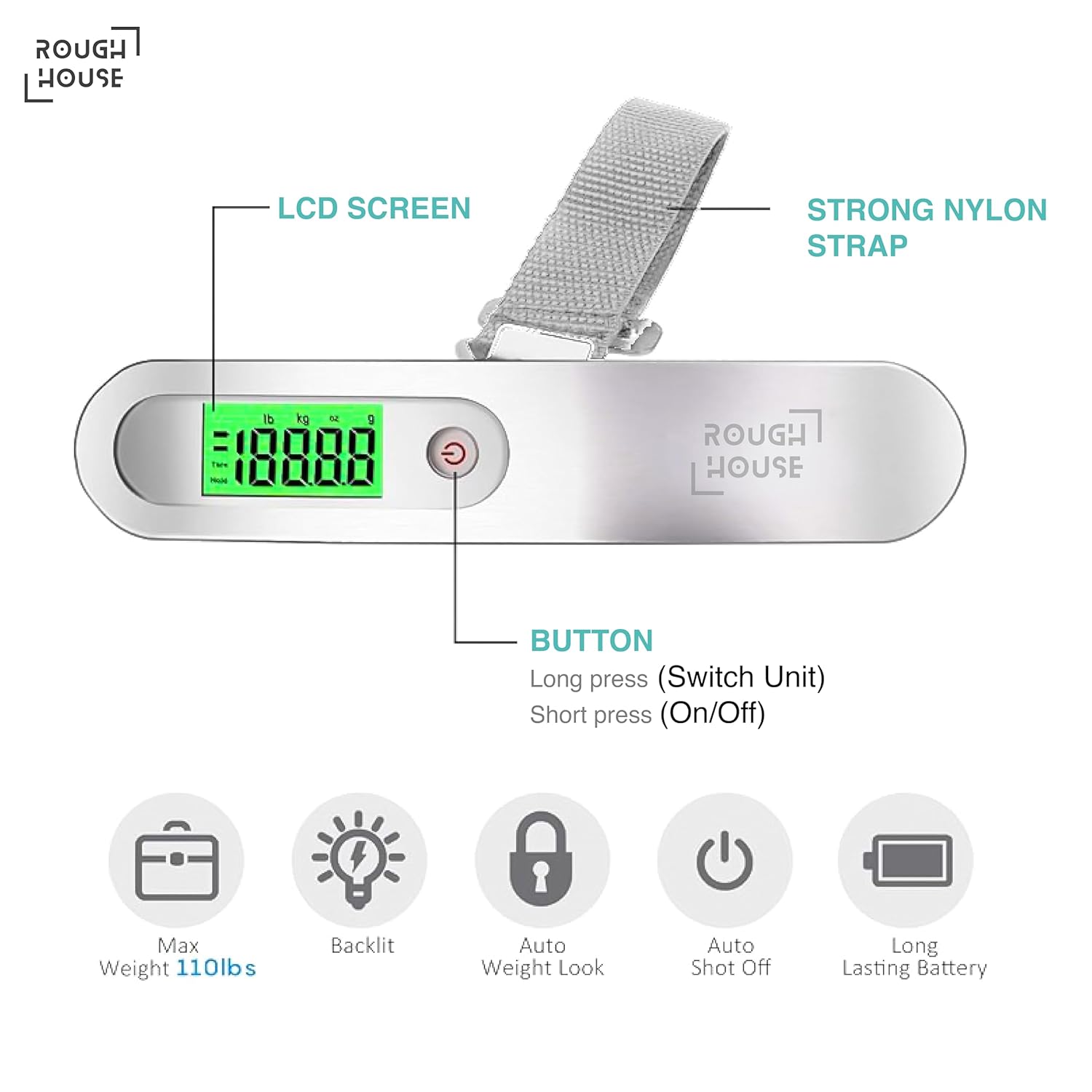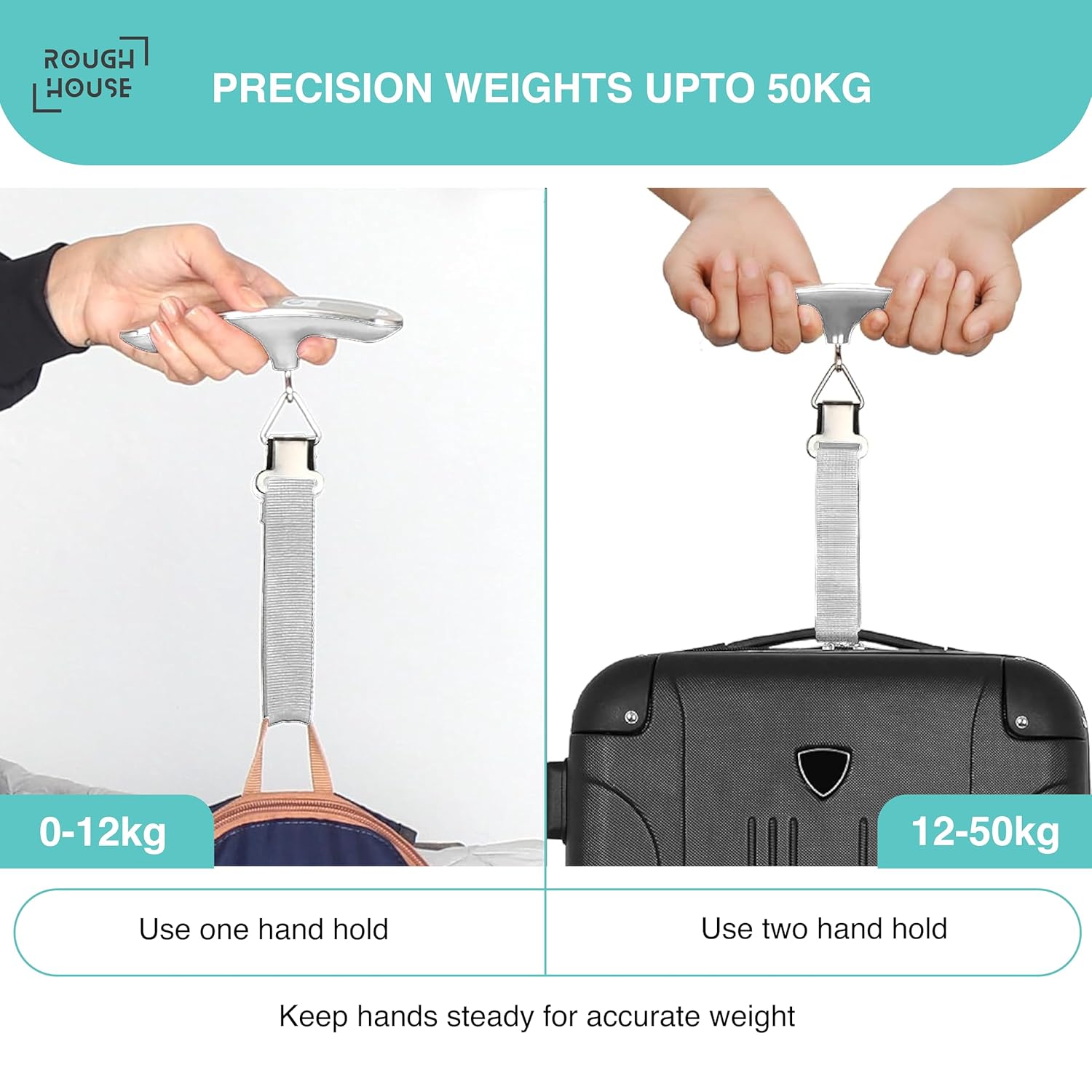 Roughhouse Digital Luggage Scale – 50kg Travel Weighing Scale for Flights | Ultra-Compact, Accurate & Tough | for Young Travellers & Backpackers