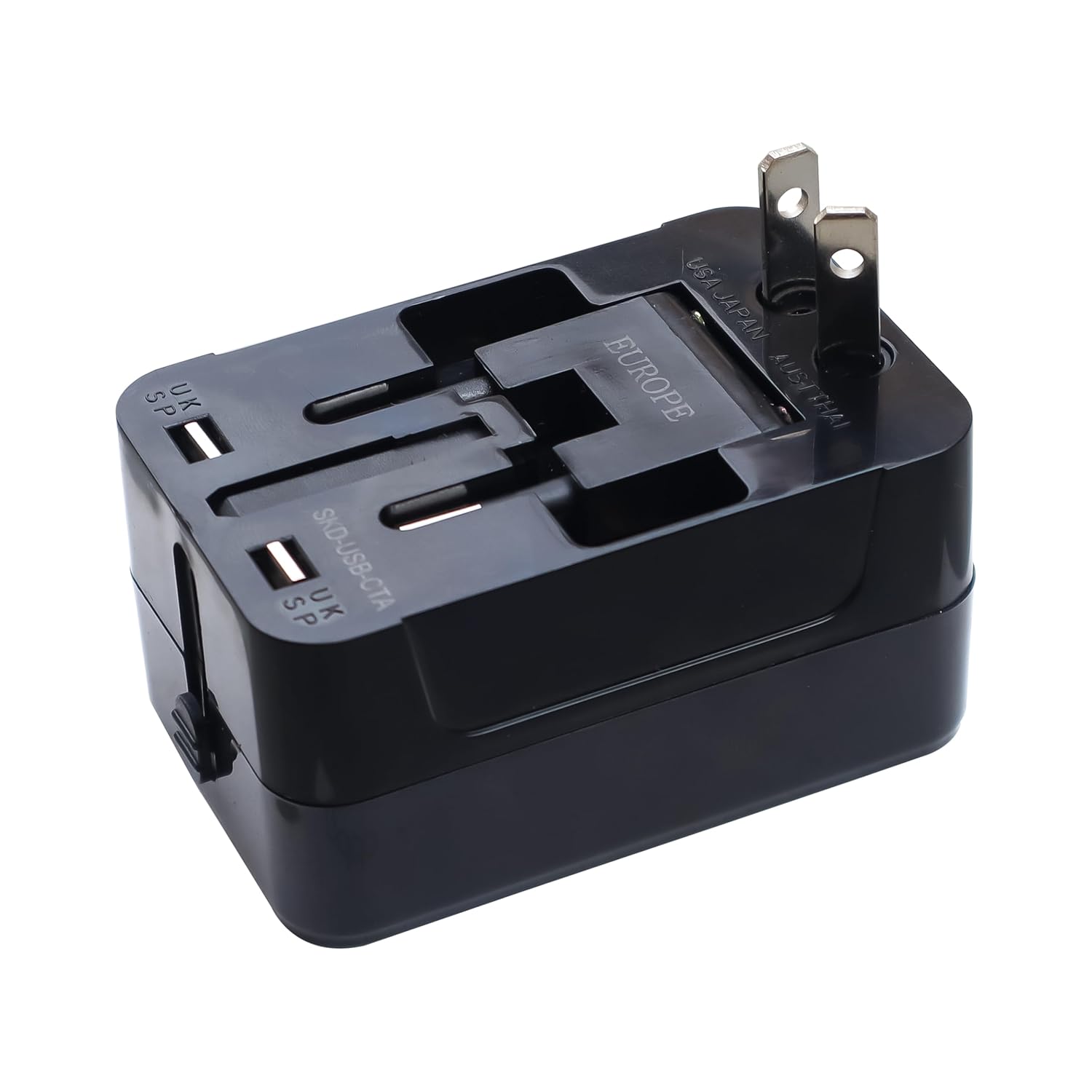 the international universal travel adapter fits US, UK, EU, and AUS plugs with surge protection