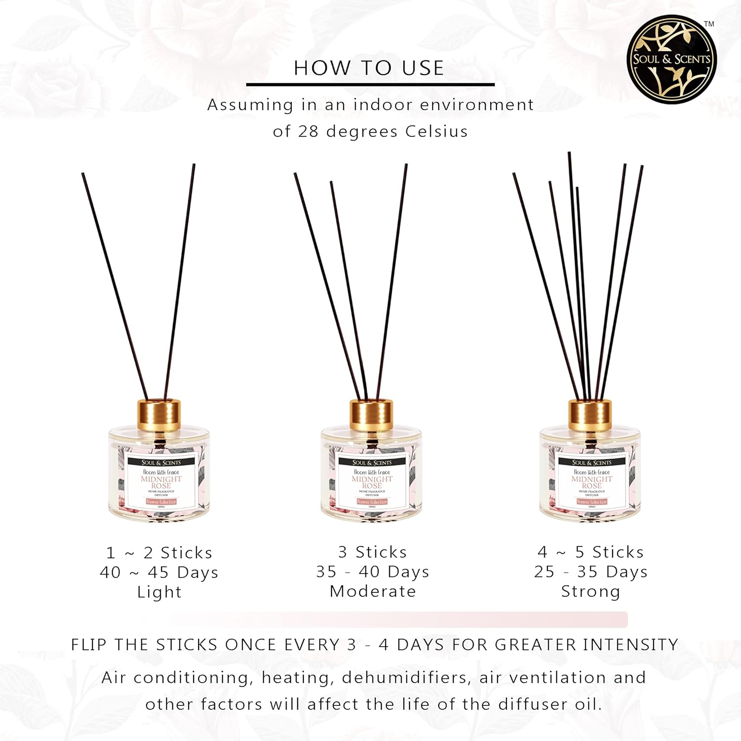 Easy to Use: The diffuser is user-friendly—simply remove the cap and plastic plug, insert the reed sticks, and adjust the quantity to achieve your preferred level of fragrance intensity.