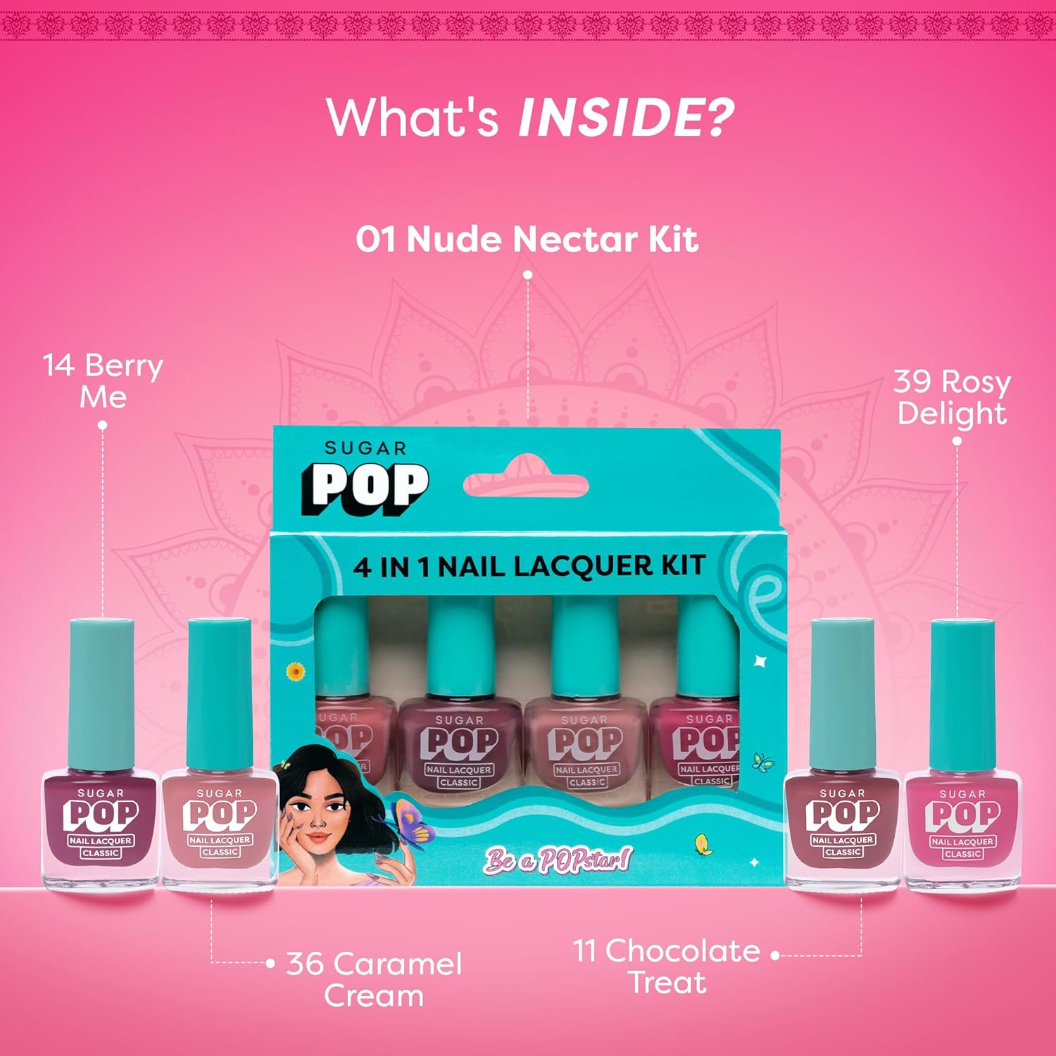 4-IN-1 NAIL LACQUER KIT: A curated set of 4 mini nail polishes in trendy shades, perfect for everyday wear, festive looks, and party-ready manicures.
