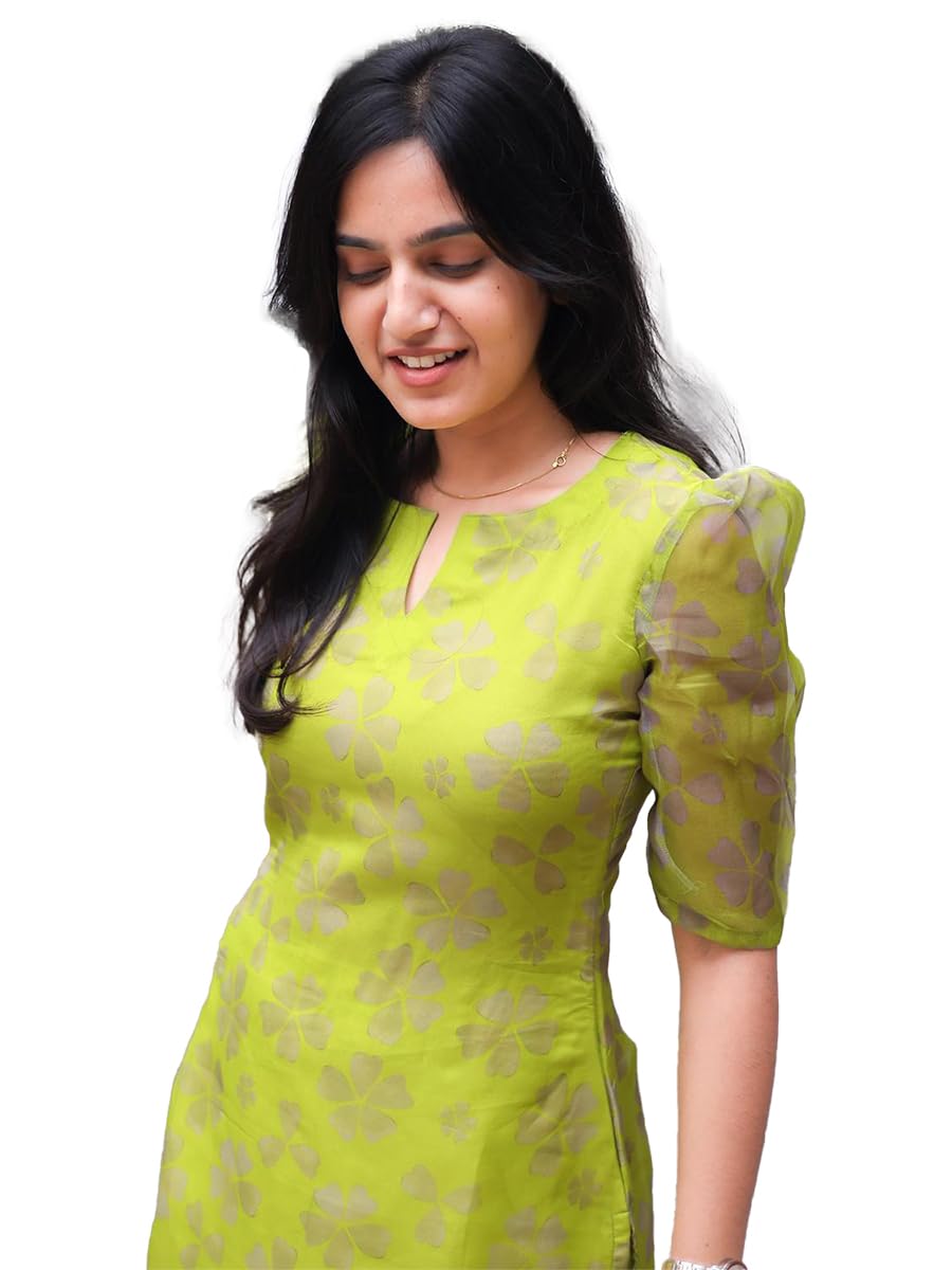 Fabric : Chanderi silkStyle :Straight Pattern : PrintedSleeves: PuffLength : Calf lengthColor : Firozi