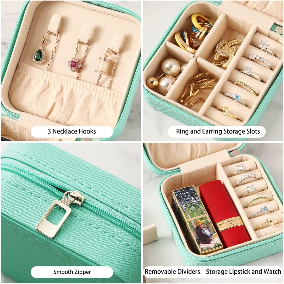 Large Capacity – The travel jewelry case with 3 necklace hooks, 1 storage pouch, ring cases and removable divider provides more flexible space to storage