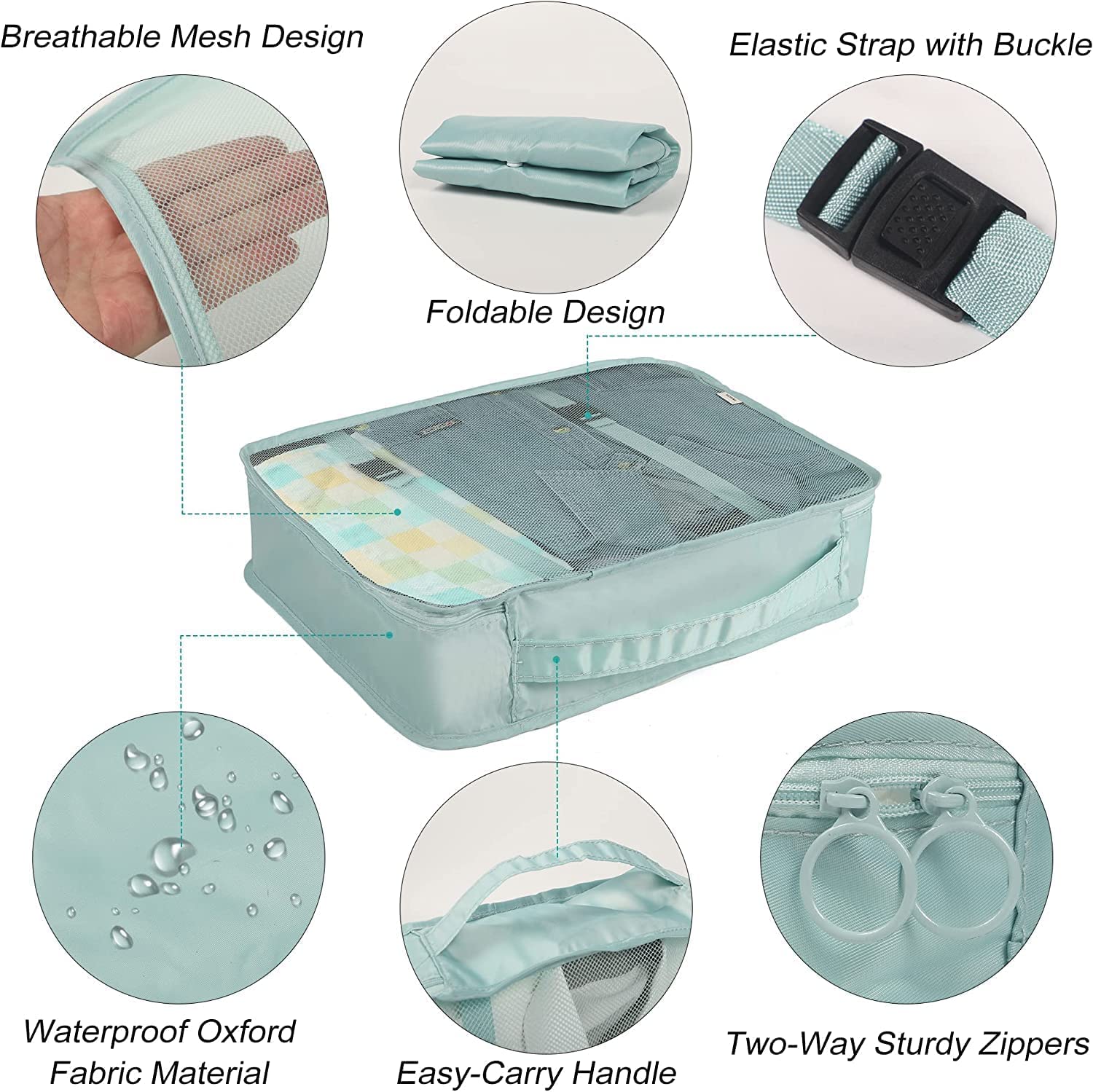 Packing Cube Set Details : 7 pcs packing organizers set ( 3 different size clothes storage bags or cubes + 3 laundry pouches which can also be used as 1 bra/underwear bag , 1 cosmetics bag , 1 toiletry bag + 1 bonus drawstring shoe bag). The 3-laundry pouch can be used for your used clothes while the compression garment bag can be used for footwears.
