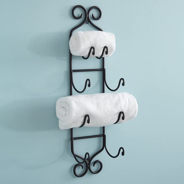 Small Black Unique Metal Wall Towel Rack. Emulates vines growing against a wall. This wrought iron towel rack holds four bath towels. Hangs 27″ down 7″ wide and 6″ deep. Towels are not included.