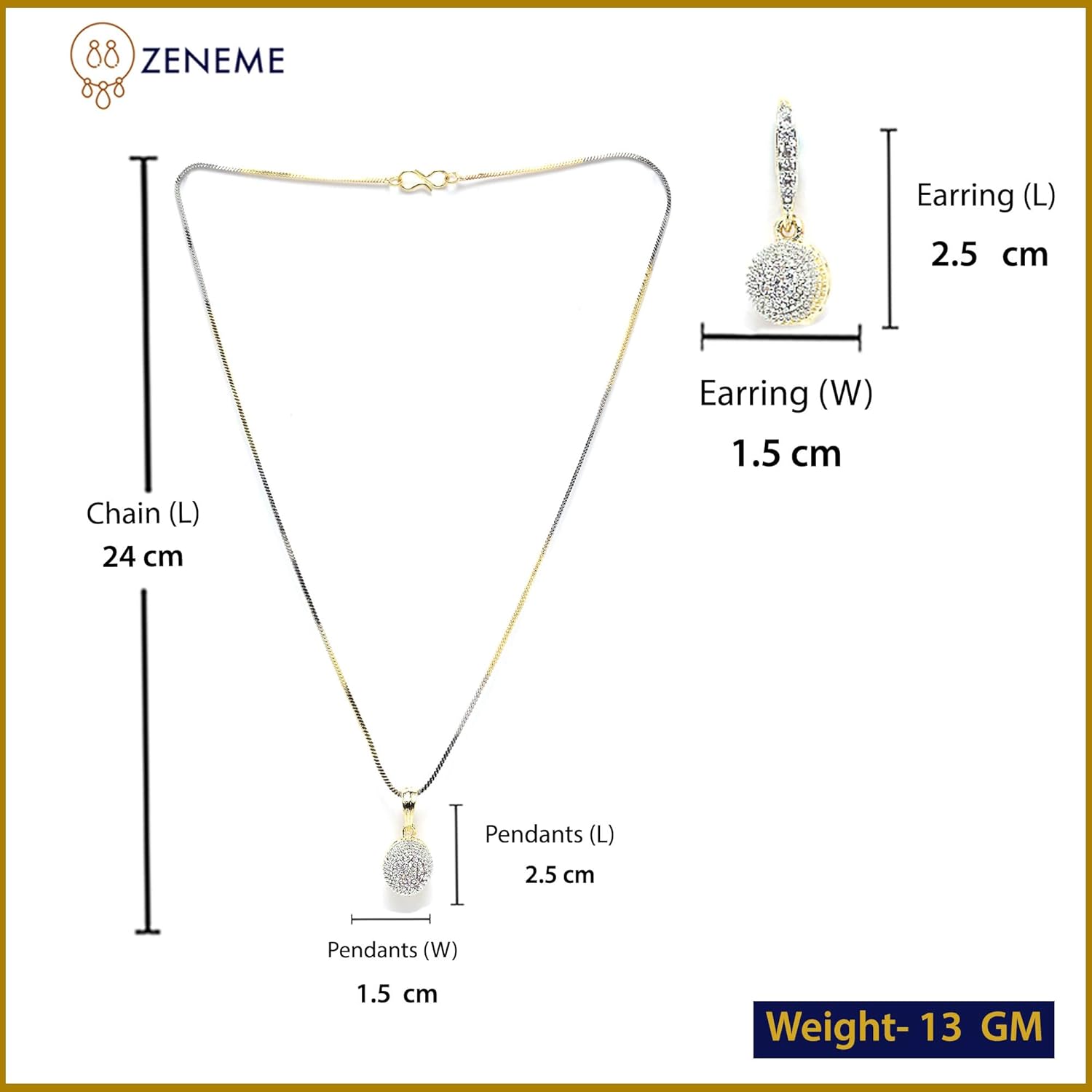 “Be a trendsetter and embrace yourself with the wide collection of ZENEME. Jewelry has its own place in our hearts. It is every woman’s best friend and more. Since a decade (2011) and with vision of fulfilling every woman’s desire to look radiant with the unique collection of jewellery which is not just a tradition, it is a form of lifestyle. Zeneme has consistently ensured that it spreads happiness with it’s masterpieces not just in India but across the globe. Stylish and Trendy Cubic Zirconia Gold plated pendant combo from the house of Zeneme.